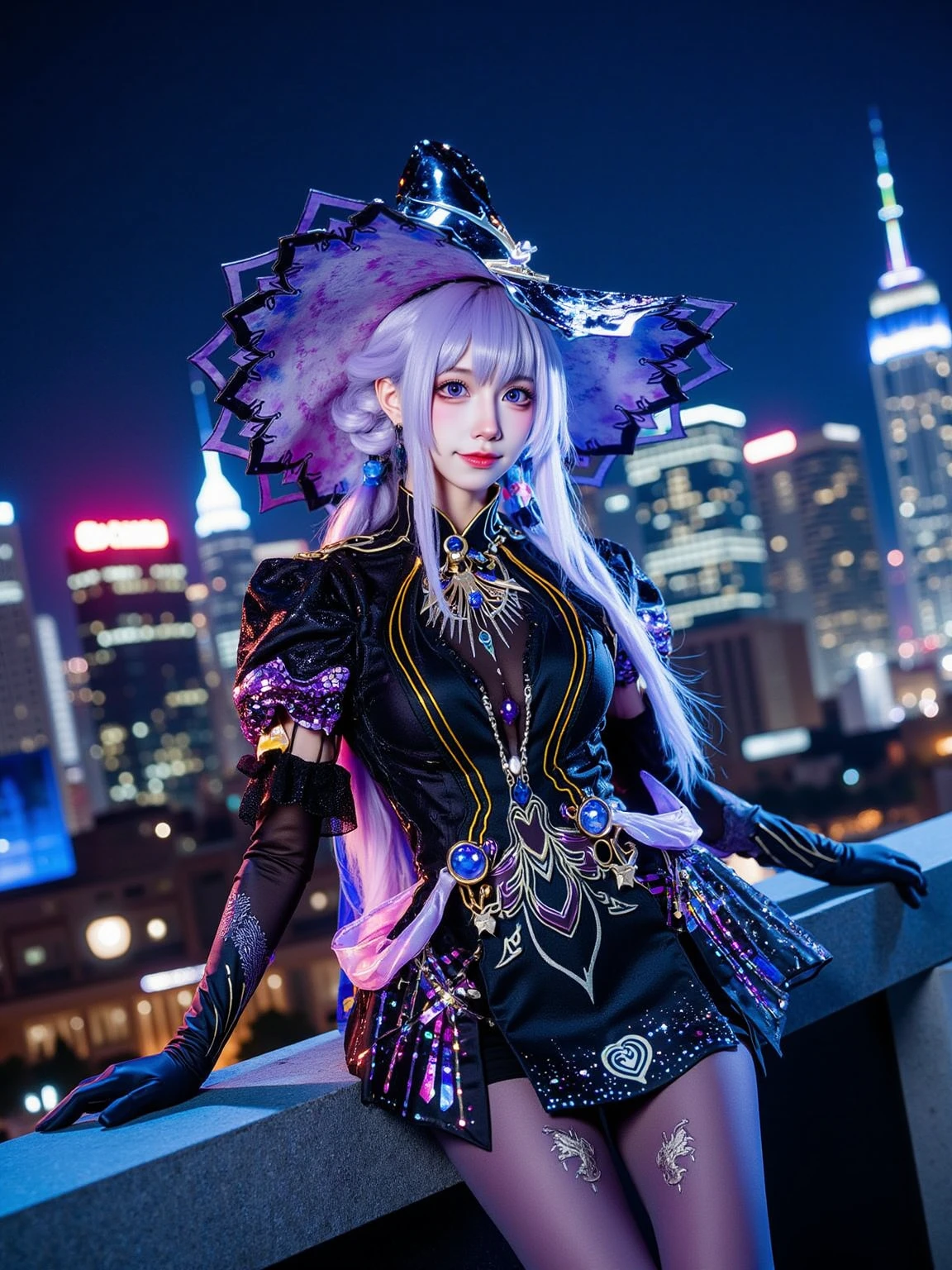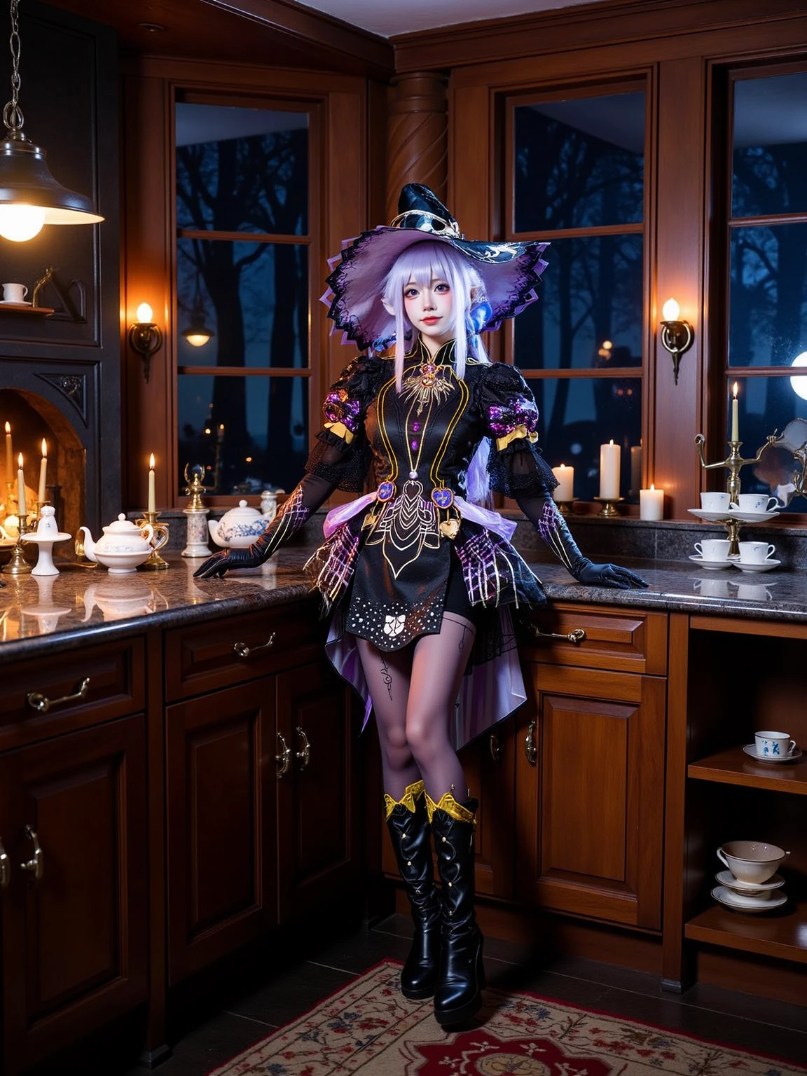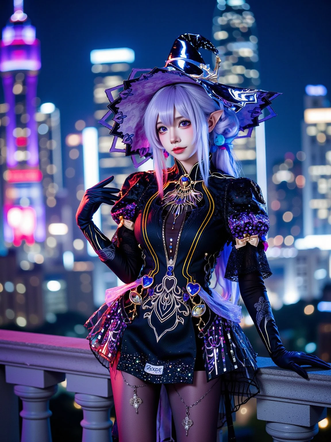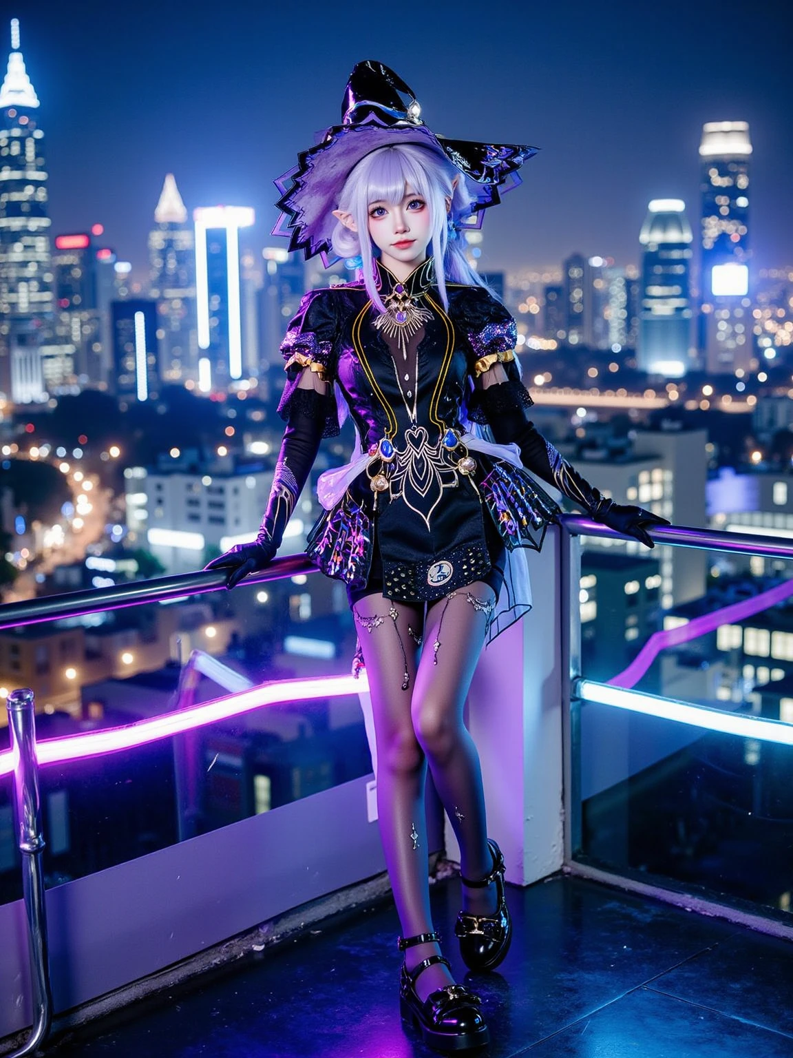A realistic photo of a tall and slender beautiful young woman in cyb-feriashen cosplay costume. She is also wearing pantyhose and black high heel boots and elbow gloves. She has purple hair with wizard hat.