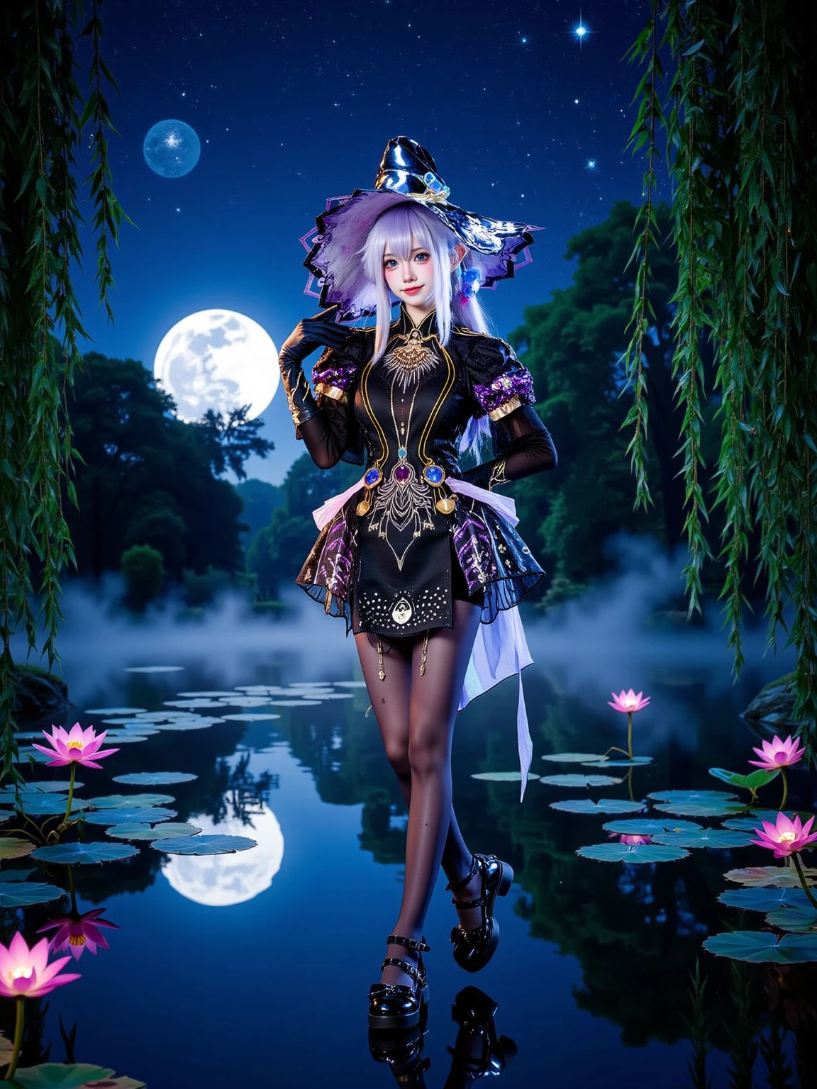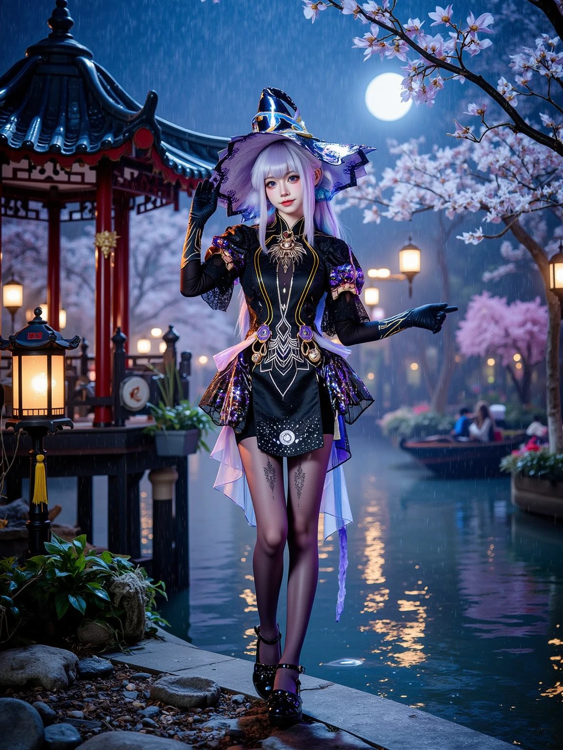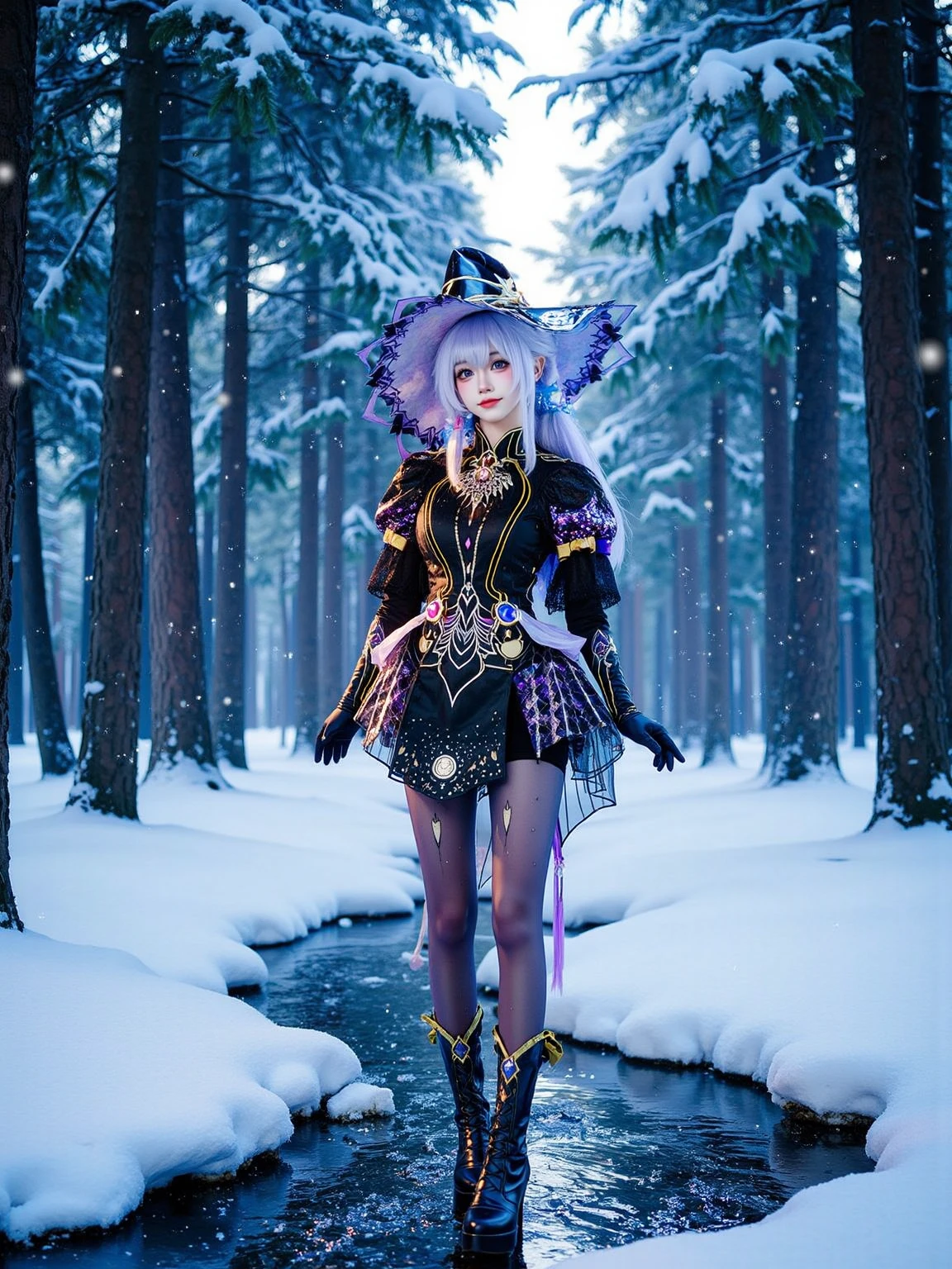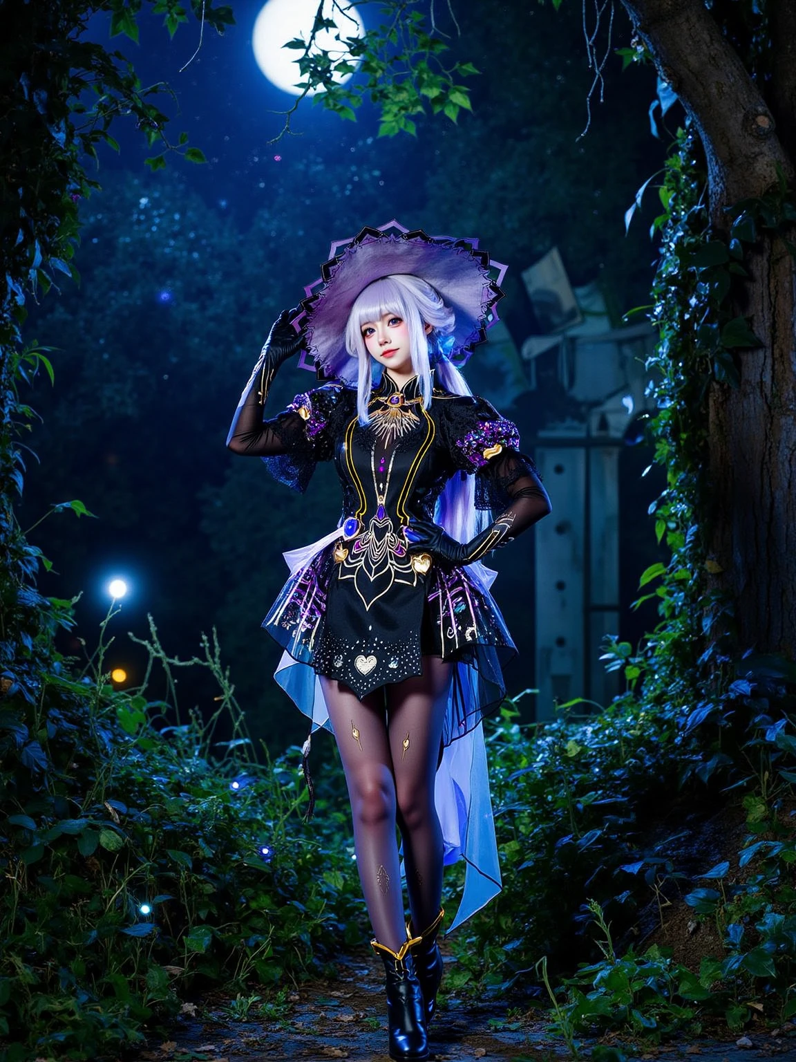 A realistic photo of a tall and slender beautiful young woman in cyb-feriashen cosplay costume. She is also wearing pantyhose and black high heel boots and elbow gloves. She has purple hair with wizard hat.