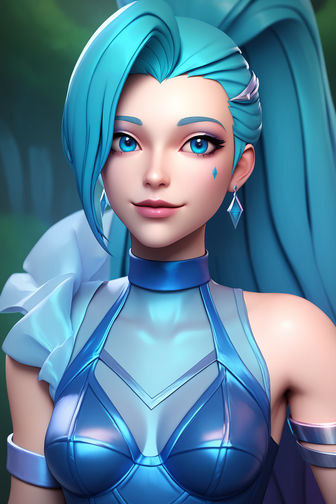 SeraphineKDAAOXL, K/DA (league of legends), blue eyes, aqua hair, long hair, ponytail, bangs, medium breasts, blue dress, armlet, bracelet, black belt, black skirt, chain, black thigh boots