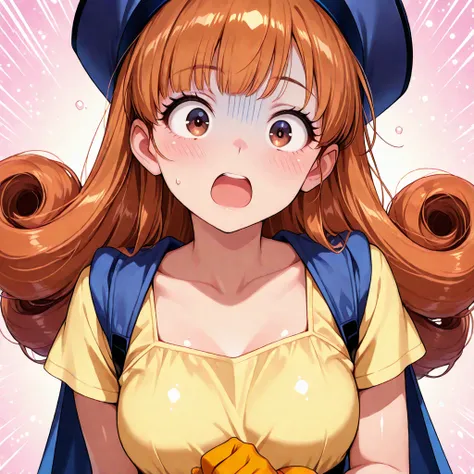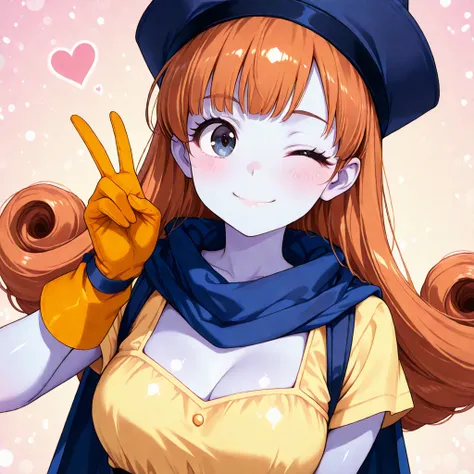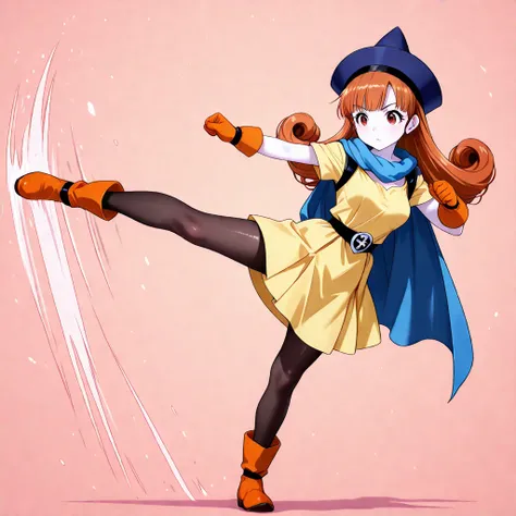 alena, cape, yeloow dress, gloves, hat, pantyhose, yellow dress, scarf, short sleeves, bright brown eyes, pupillary, chestnut-colored hair, curly hair, long hair,eyebrows, lashes, short sleeves yellow dress and gloves, blue hat and cape and scarf,