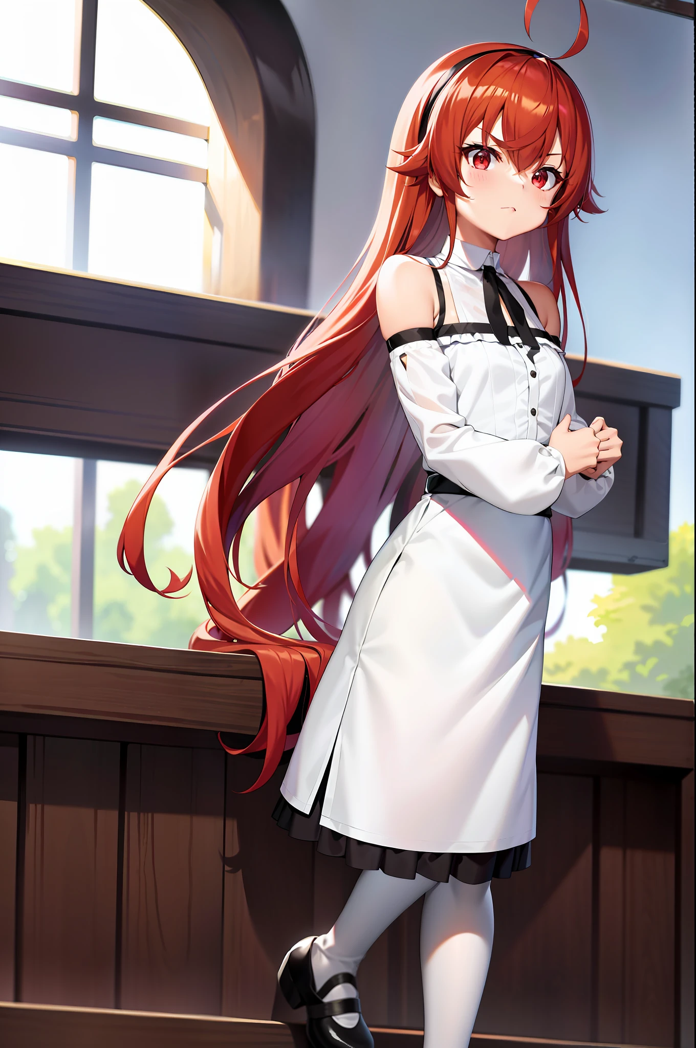 Anime girl with long red hair and white coat standing in front of a window