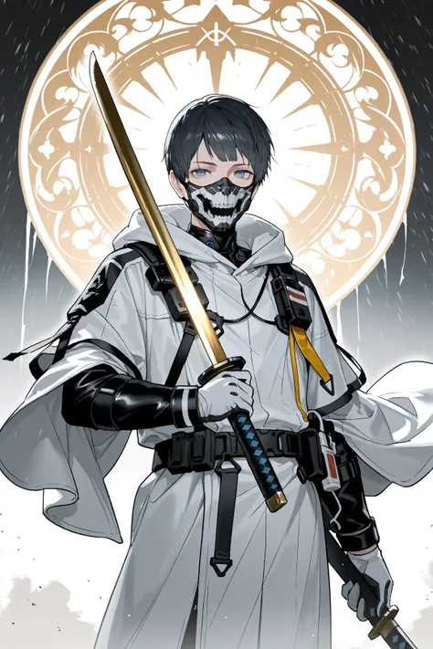 A teenager in a black robe with a black scythe stands on a suspended clock