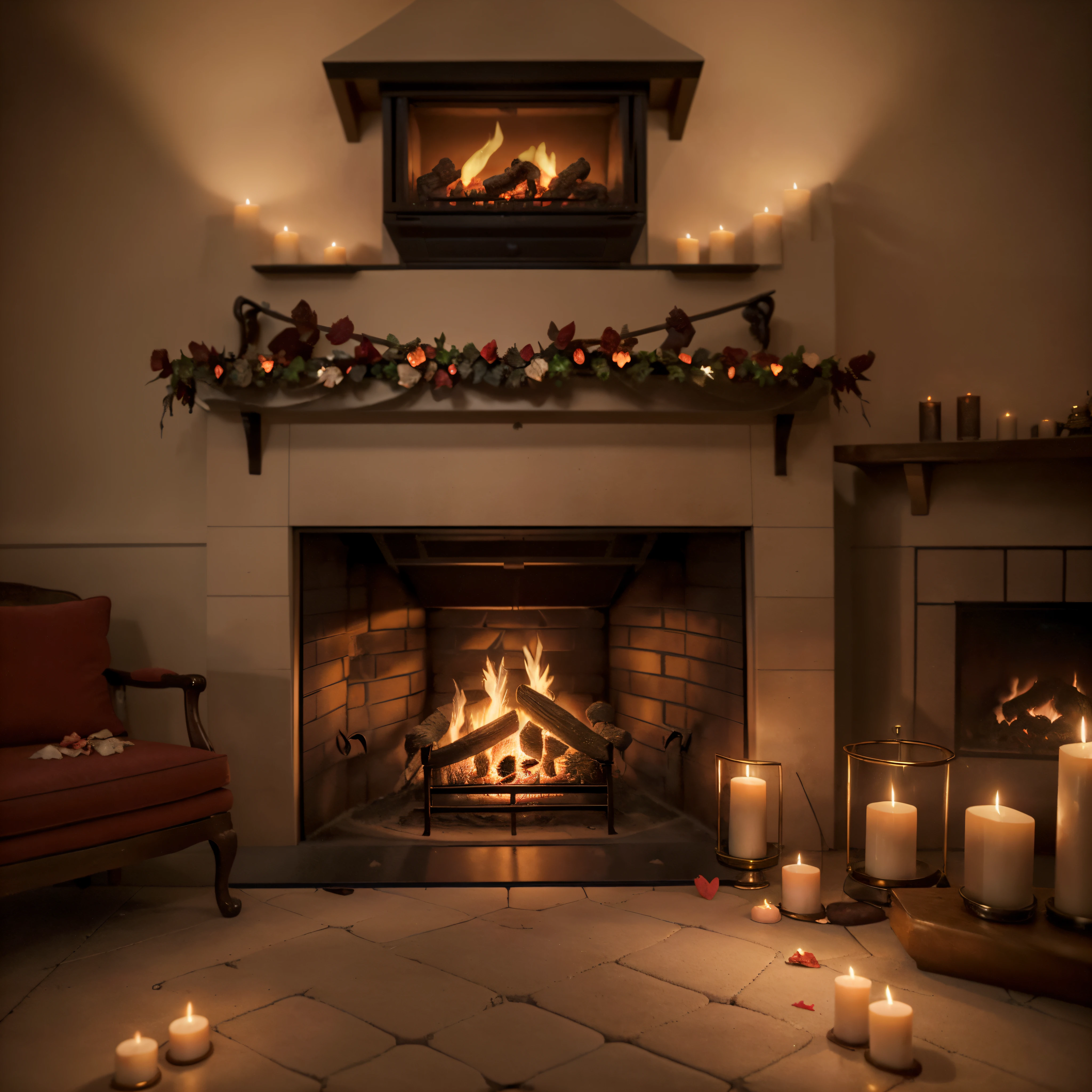 Candles are lit in front of a fireplace with a mantle