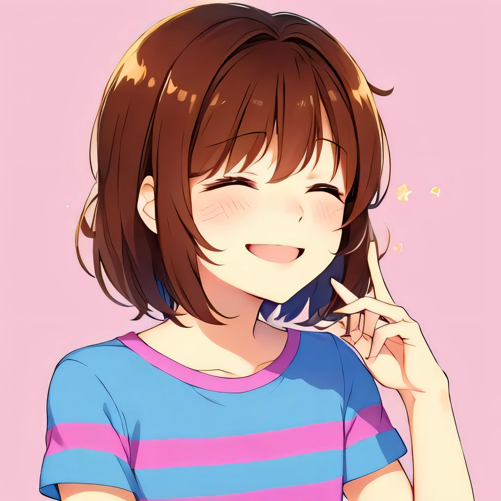 Anime girl with brown hair and blue and pink shirt talking on a cell phone