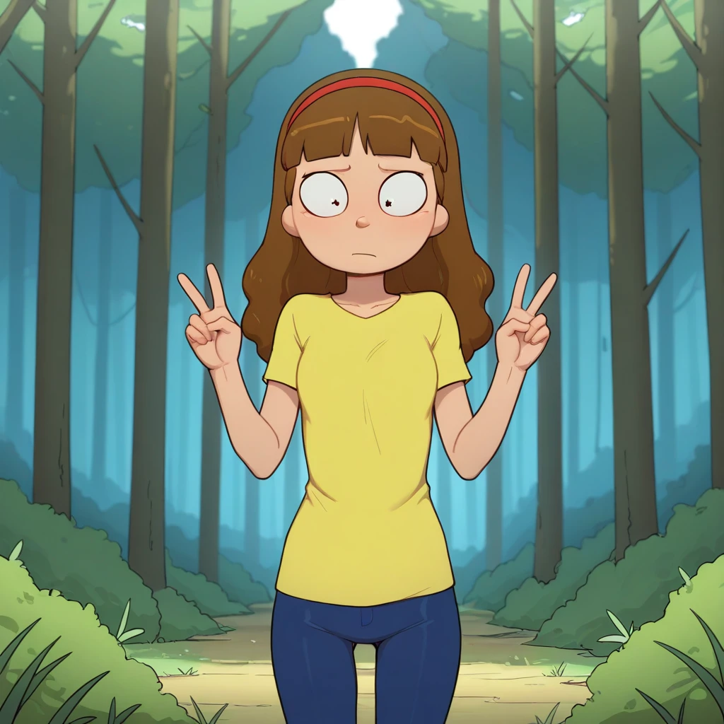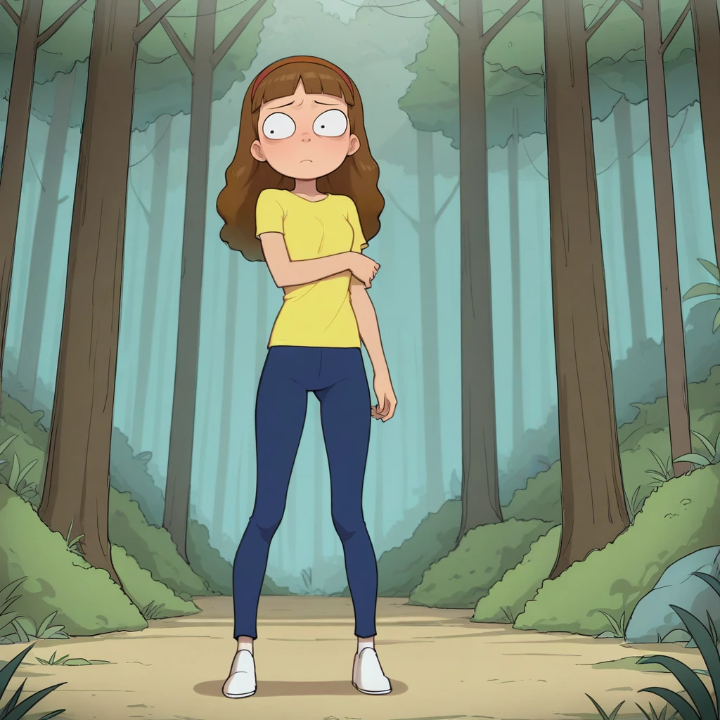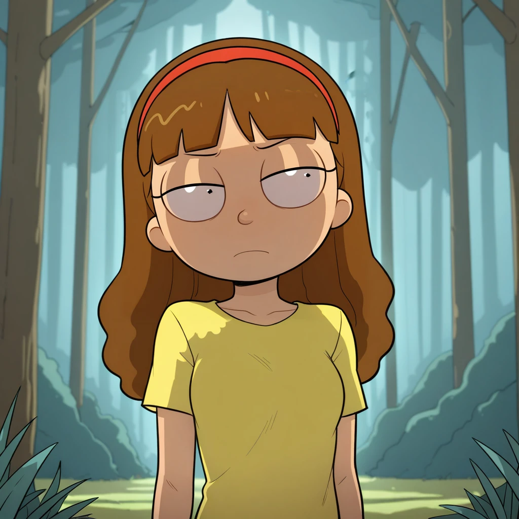 xmorticiax, rick and morty, 1girl, solo, brown hair, long hair, red hairband,