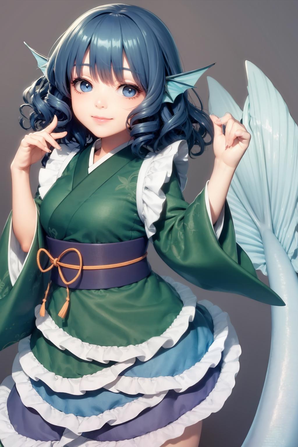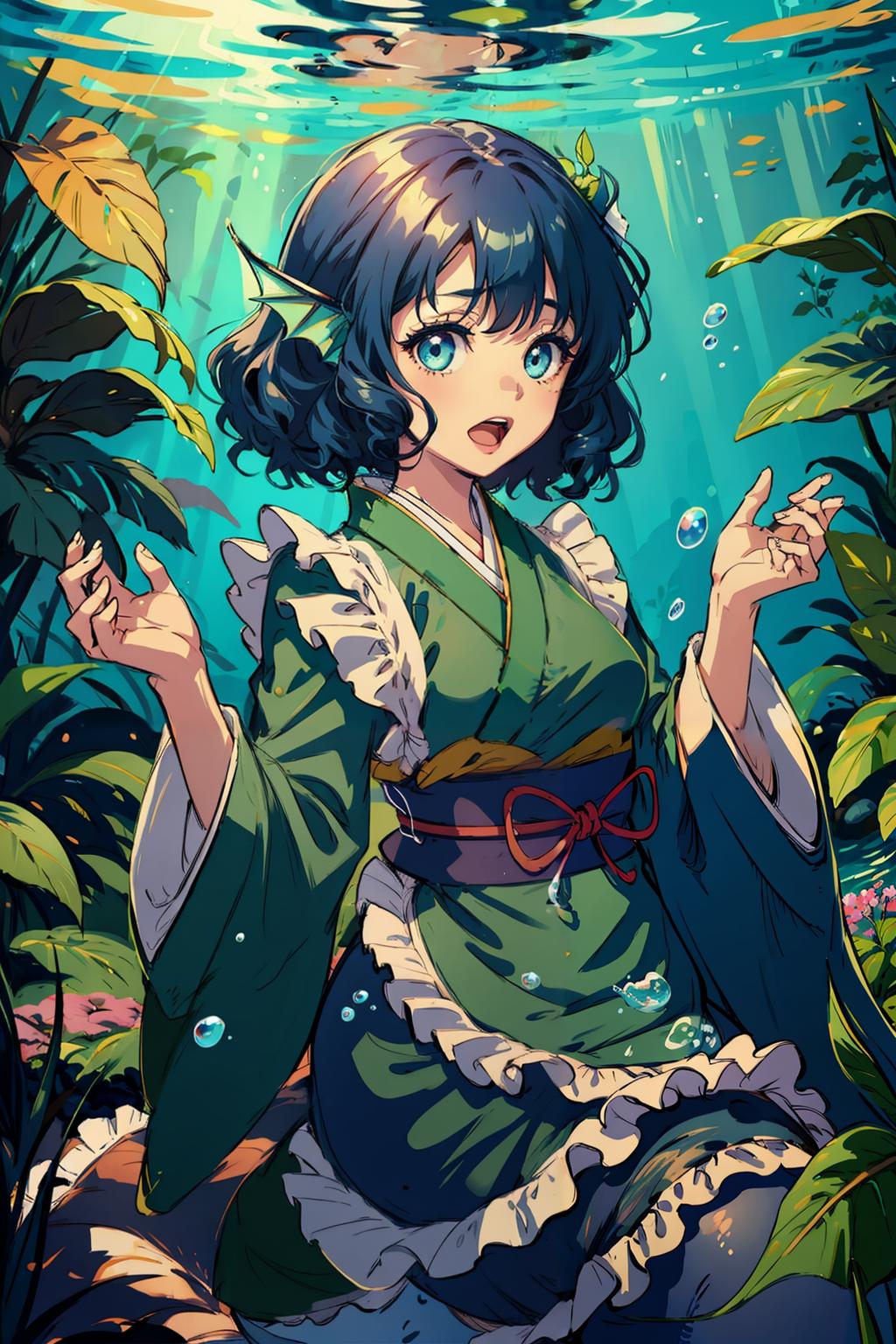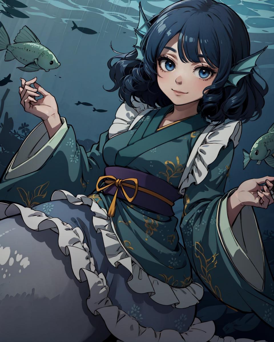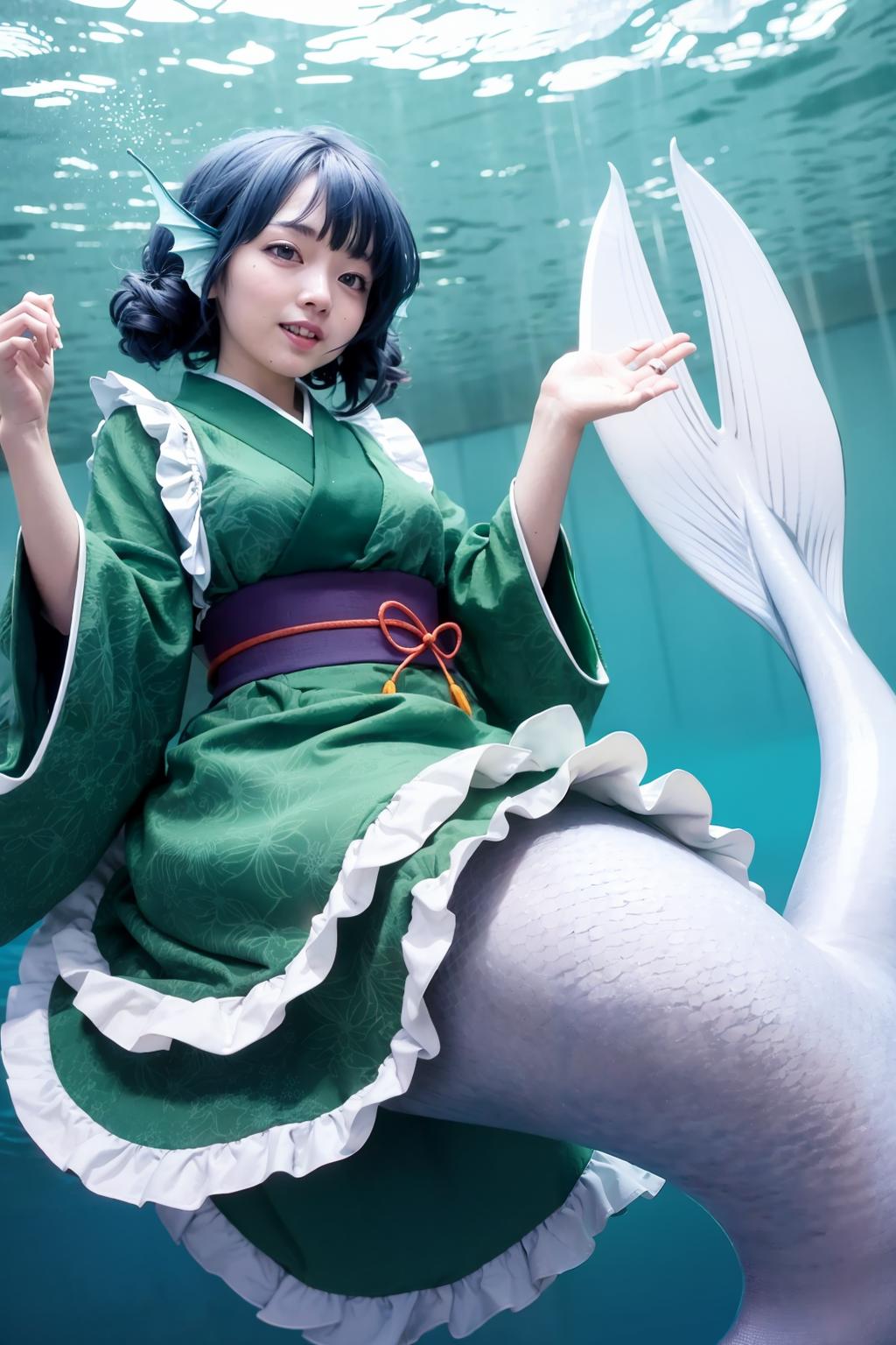 1girl,mermaid, monster girl,blue hair,short hair,blue eyes,head fins,japanese clothes, kimono,sash,obi,wide sleeves, long sleeves,
