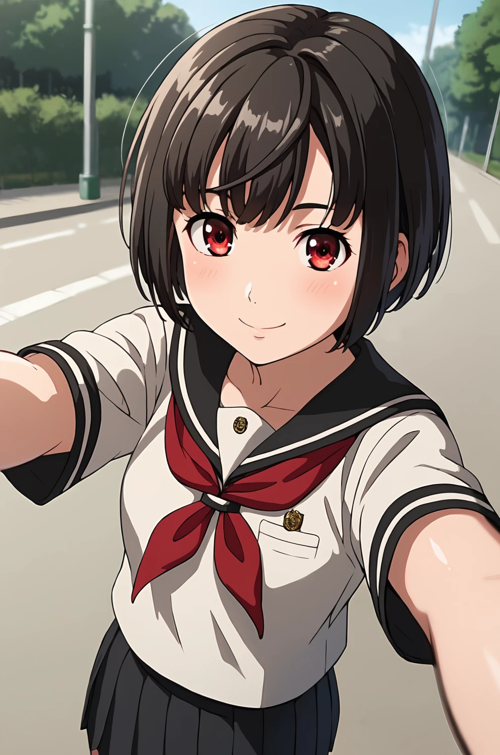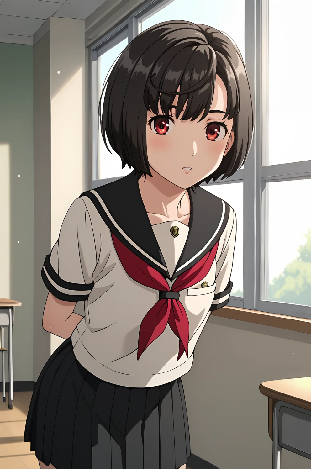 aiko_wz, black hair, short hair, red eyes, school uniform, serafuku, red neckerchief, short sleeves, black skirt, pleated skirt