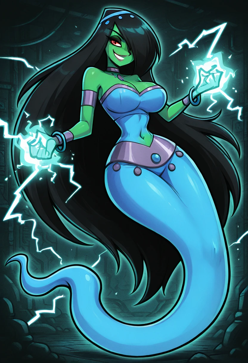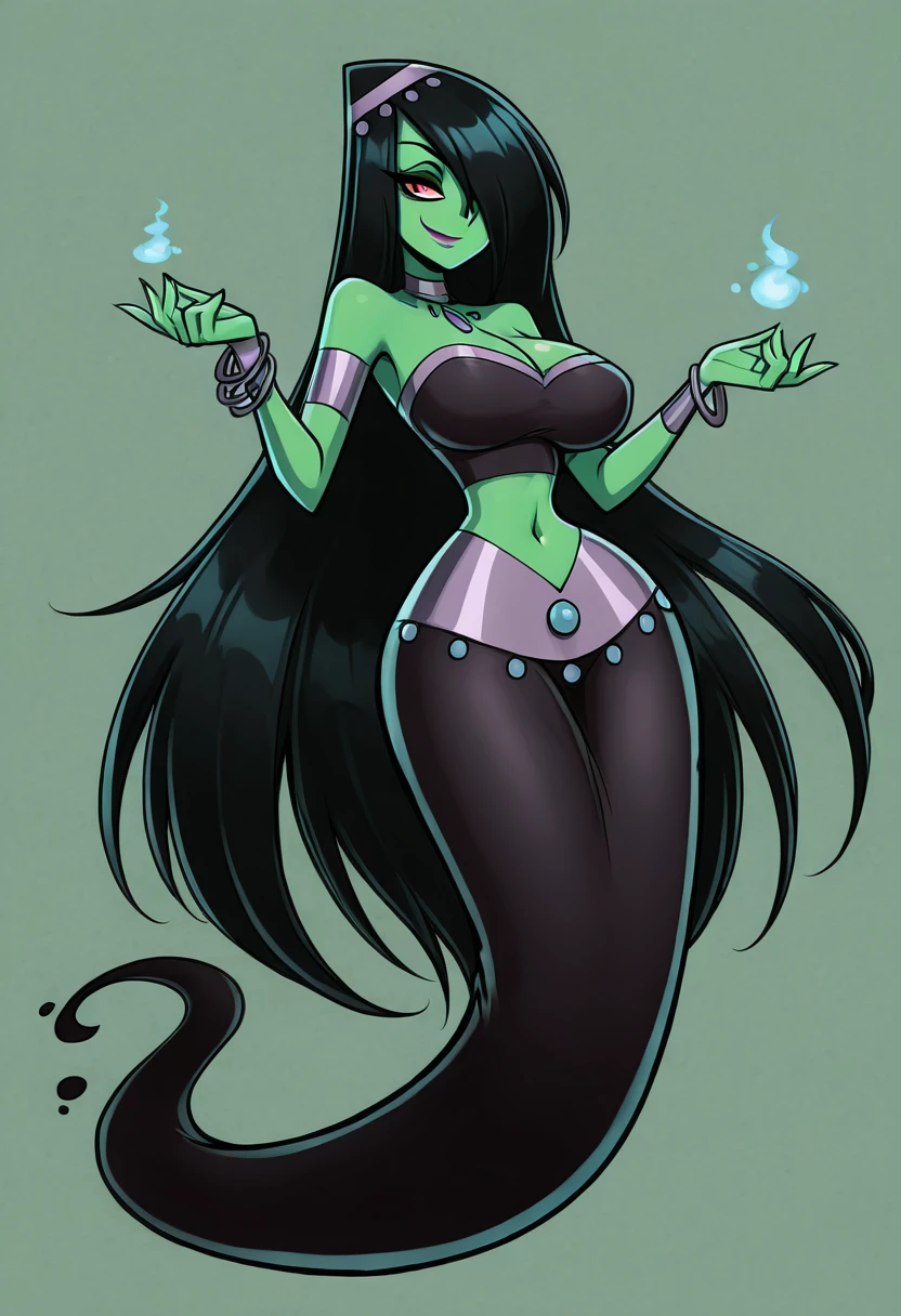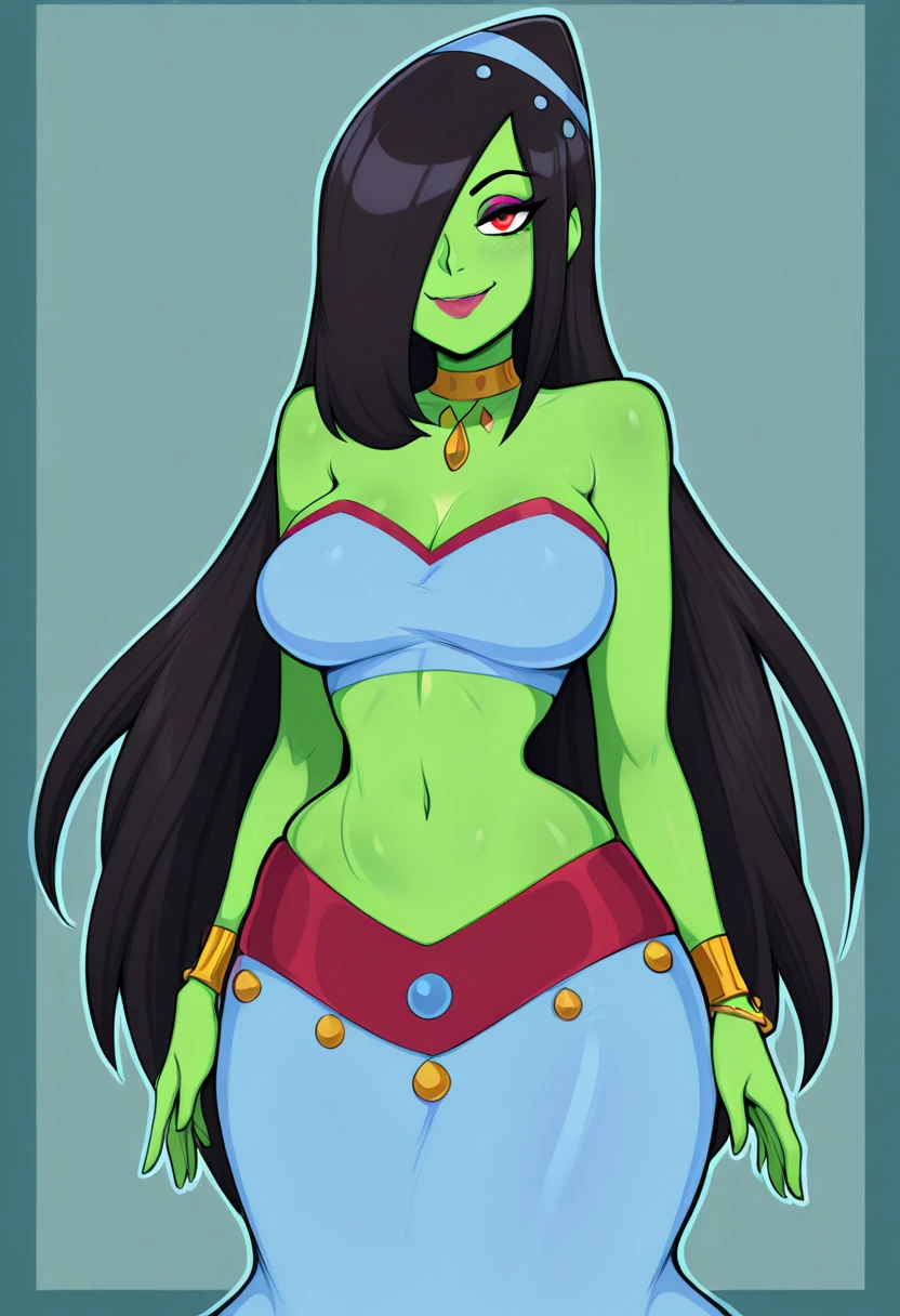 zzDesiree, red eyes, long hair, black hair, green skin, very long hair, hair over one eye,