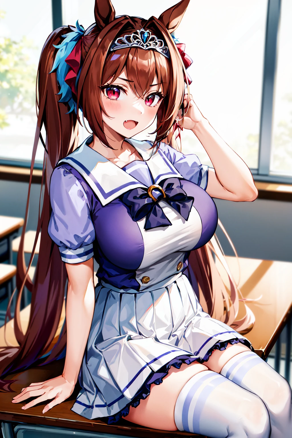 1girl, horse ears, solo, daiwa scarlet (umamusume), tracen school uniform, white thighhighs, white skirt, twintails, sailor shirt, puffy short sleeves, horse tail, very long hair, brown hair, bow, sailor collar, bowtie, purple shirt, hair intakes, tiara, fang, red eyes, ?????????????, bangs