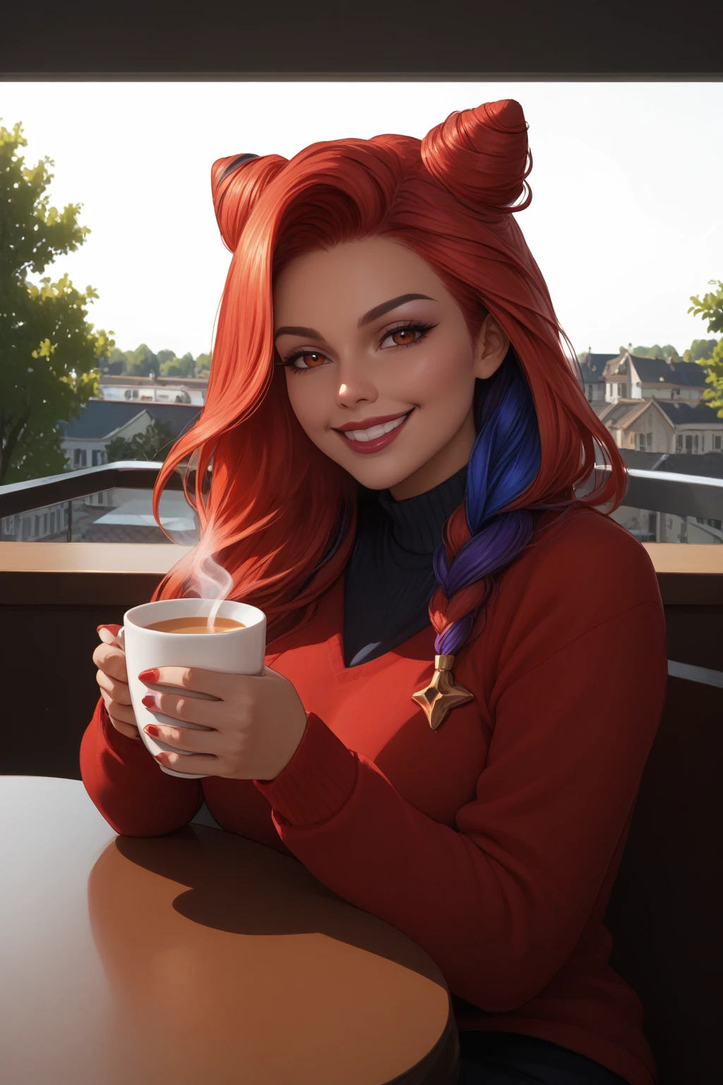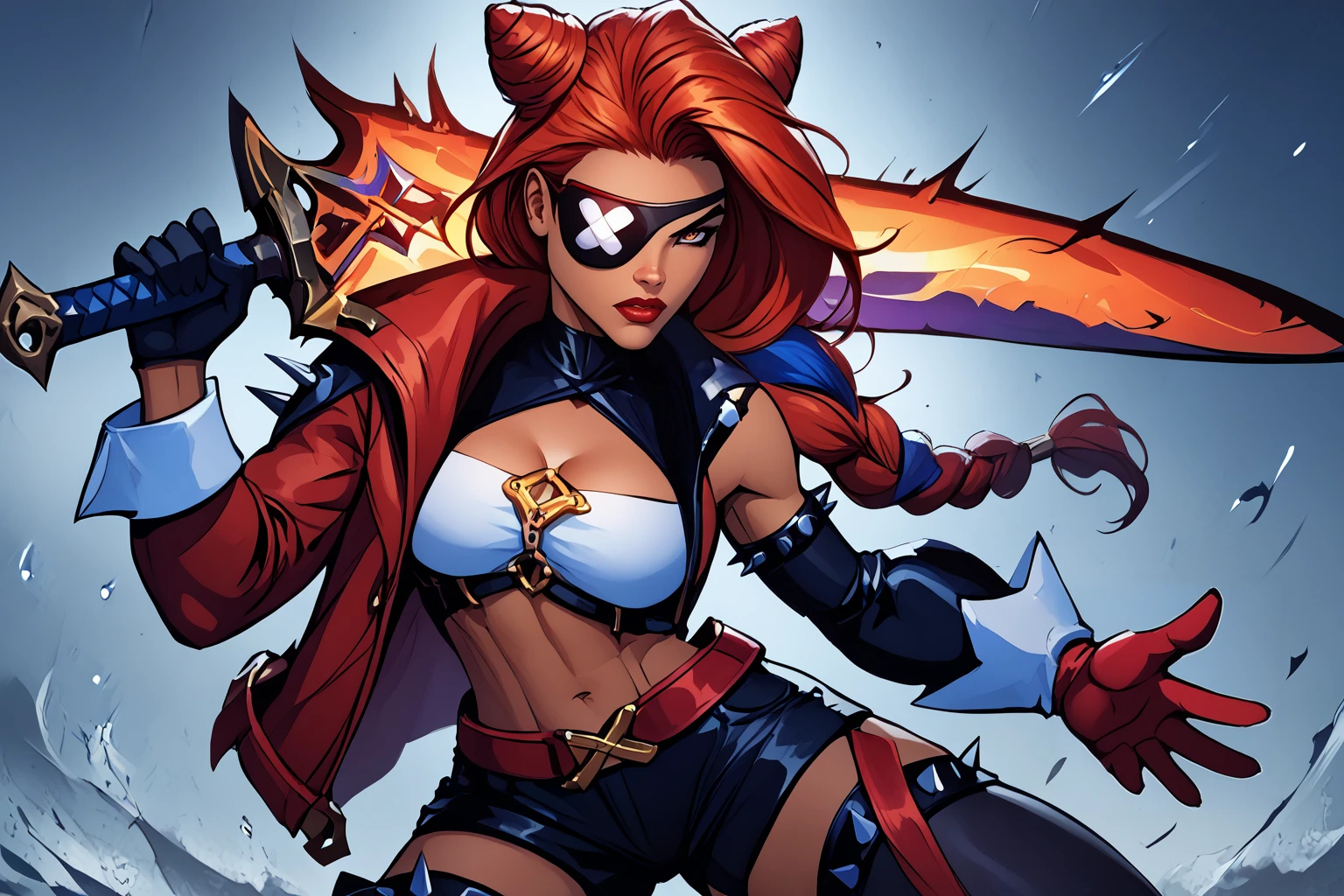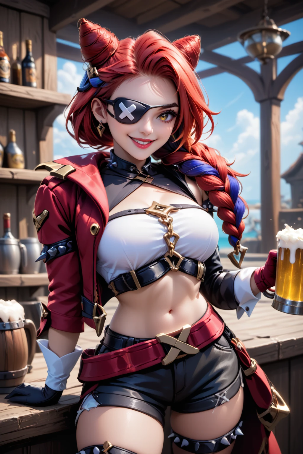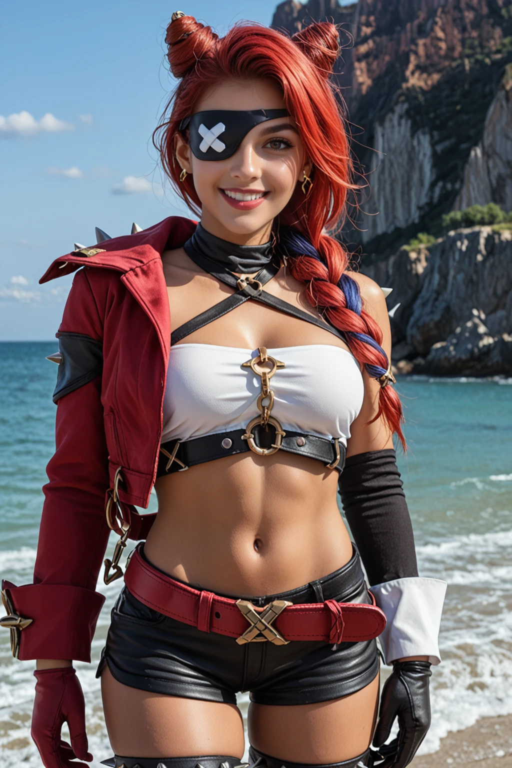 Trigger : SFSmira, long hair, multicolored hair, braided ponytail, double bun, hair ornament, eyepatch, red jacket, single ???? shoulder, shoulder spikes, collared halterneck, cleavage cutout, single black detached sleeve, red glove, black glove, armlet with spikes, loose belt, pirate sash, shorts, holster, single thigh strap with spikes, asymmetrical legwear, boots