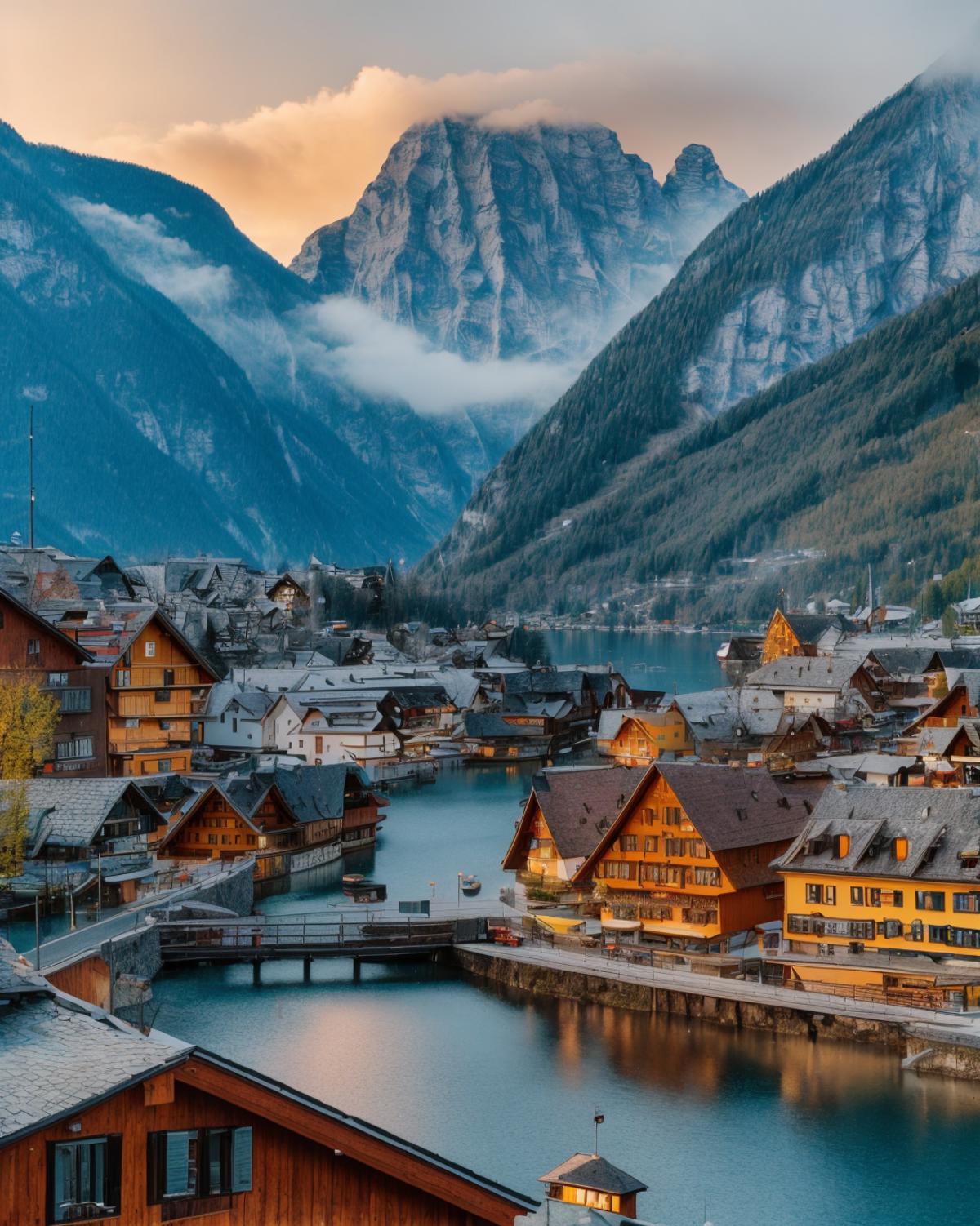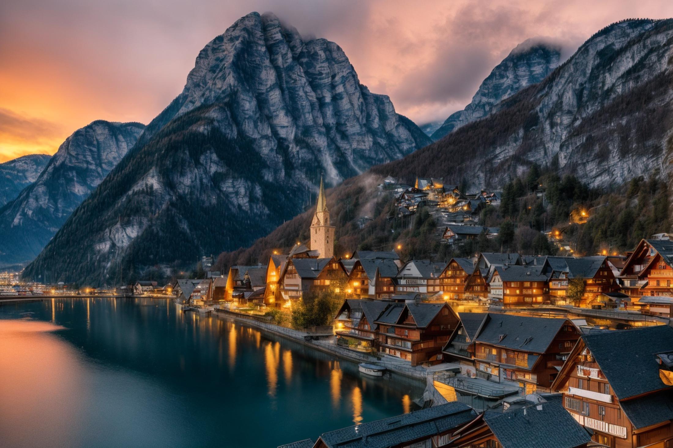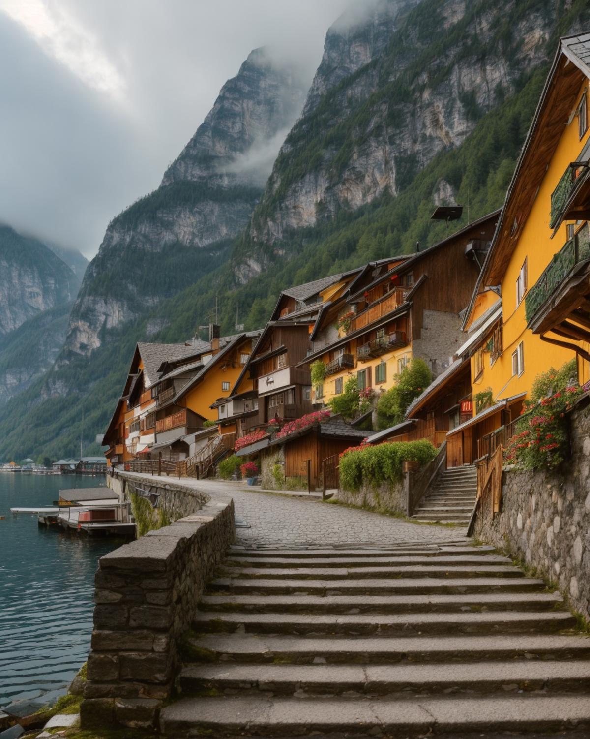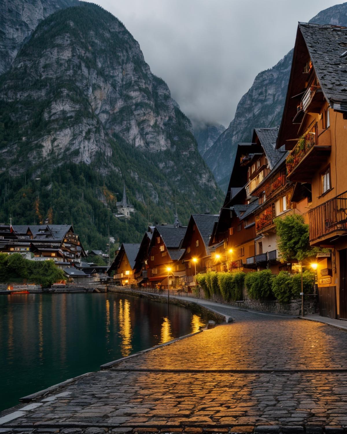 Responds well to prompts like mountains, fog lake, tower, buildings, docks, shore, etc.