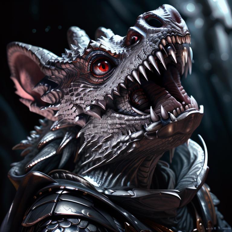 armor, bandages, belt, black background, black eyes, blurry, blurry background, bracer, breastplate, brown belt, brown eyes, cape, chainmail, claws, closed mouth, dagger, depth of field, fangs, full armor, gauntlets, gloves, greatsword, green eyes, helm, helmet, holding, holding dagger, holding knife, holding polearm, holding sword, holding weapon, horns, jewelry, knife, kobald, long hair, long sleeves, looking at viewer, mask, necklace, open mouth, orange eyes, pauldrons, plate armor, polearm, realistic, red cape, red eyes, red scarf, scales, scarf, sharp teeth, , sheathed, shoulder armor, slit pupils, solo, spear, spikes, staff, standing, sword, teeth, upper body, vambraces, weapon, weapon on back, whiskers, white hair, yellow eyes
