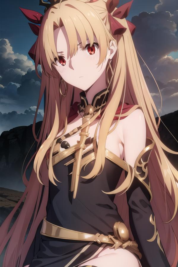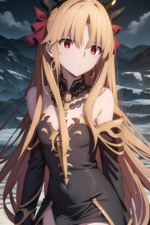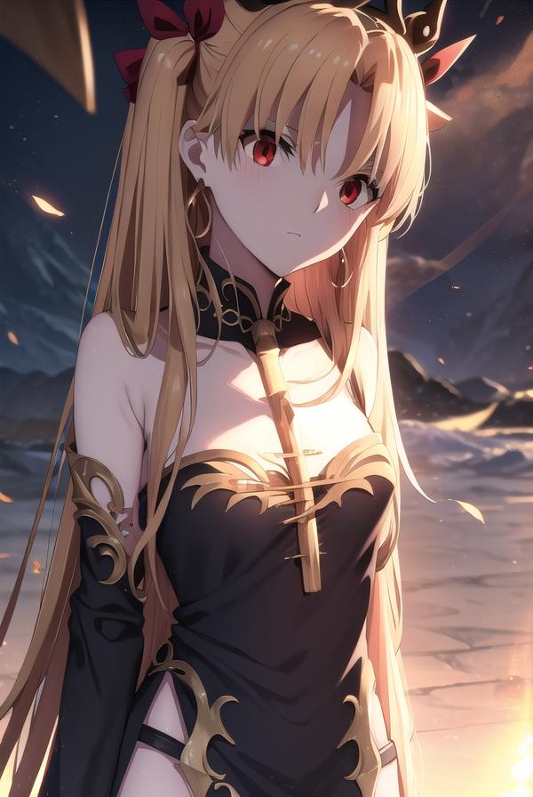 ereshkigal, blonde hair, earrings, hair bow, hoop earrings, jewelry, long hair, parted bangs, (red eyes:1.5), two side up