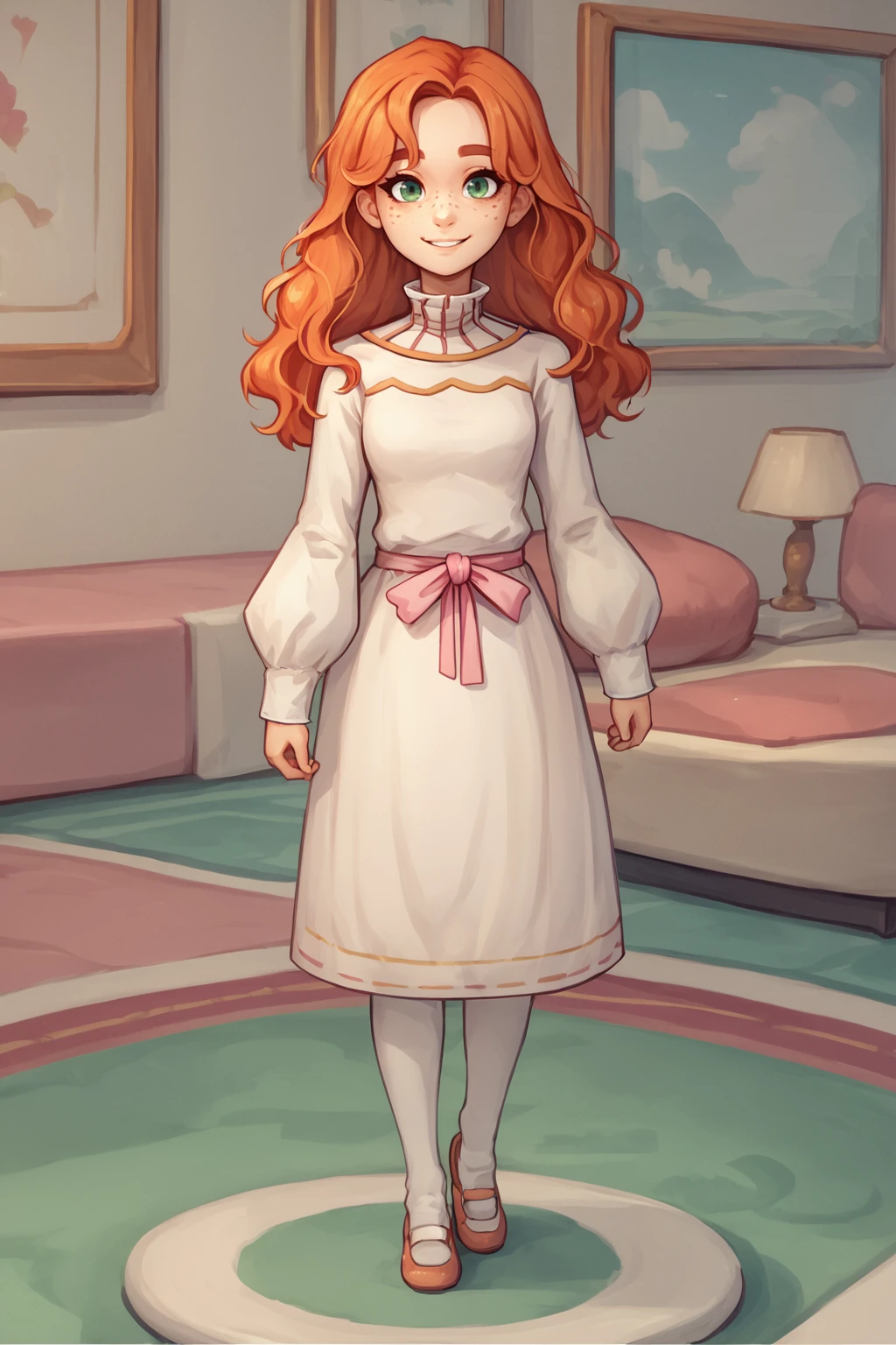 For the pretty dress of her's use "white dress, pink ribbon, long sleeves, puffy sleeves, high collar"