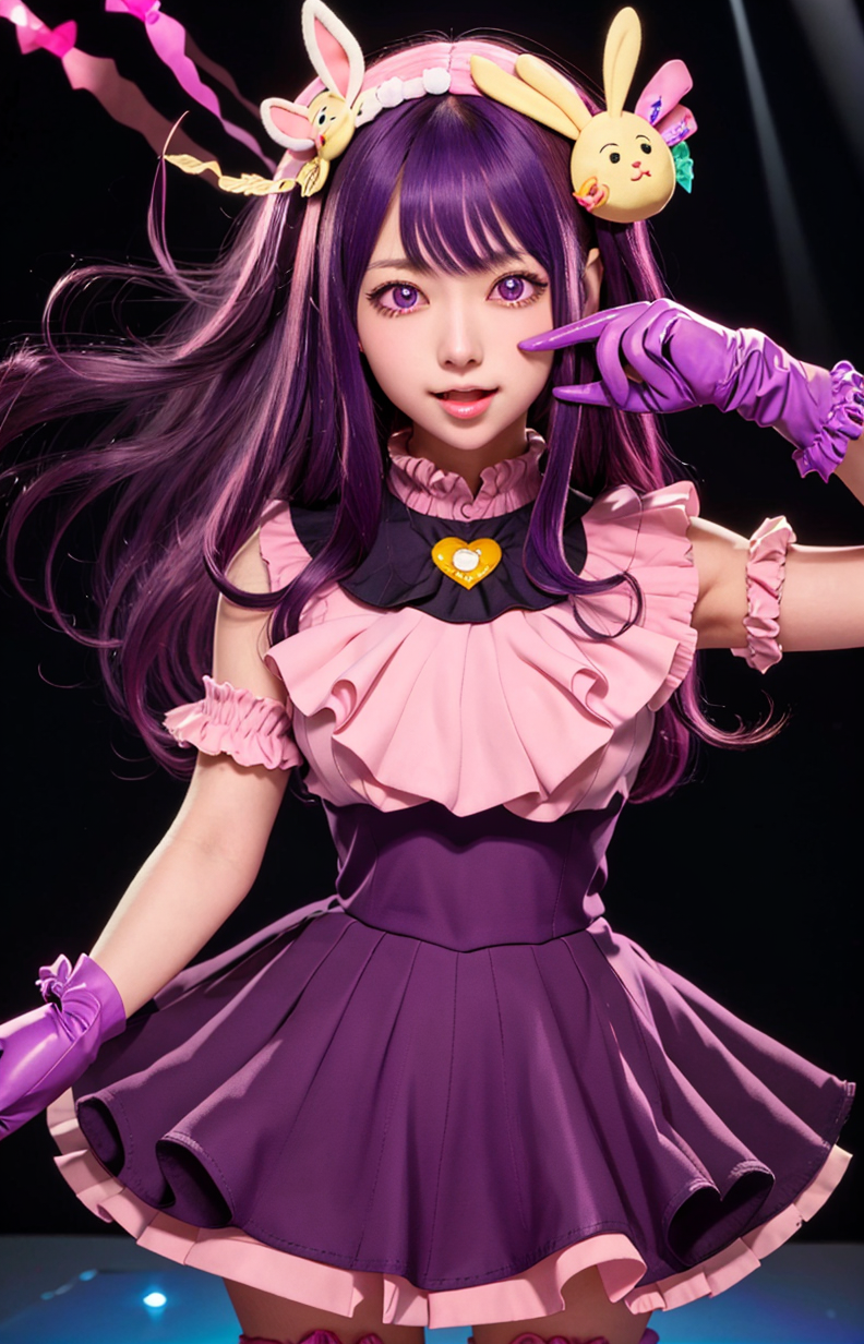 tongue out, tongue, pink gloves, solo, smile,hair ornament, dress, bangs