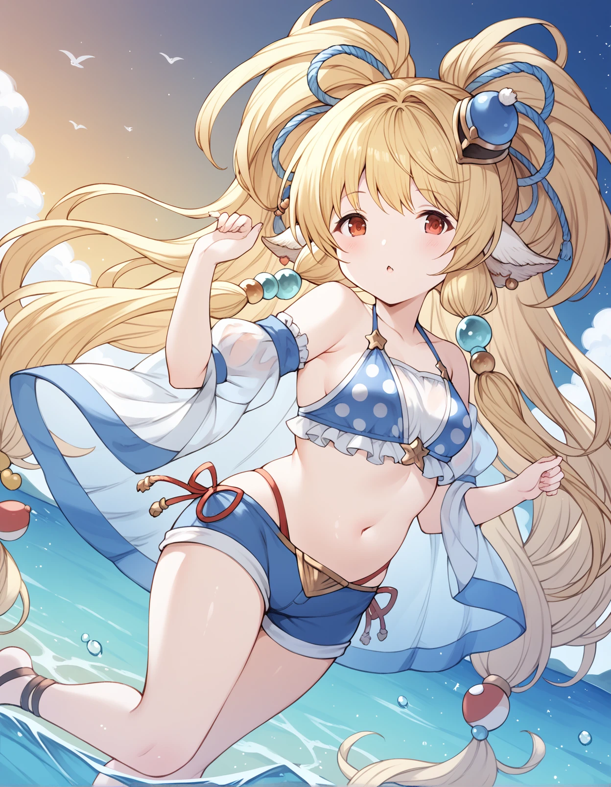 Swimsuit:gbfmahiraswim, mahira \(granblue fantasy\), 1girl, harvin, blonde hair, hair ornament, long hair, very long hair, twintails, animal ears, red eyes, polka dot ??????, detached sleeves, see-through, shorts, sandals