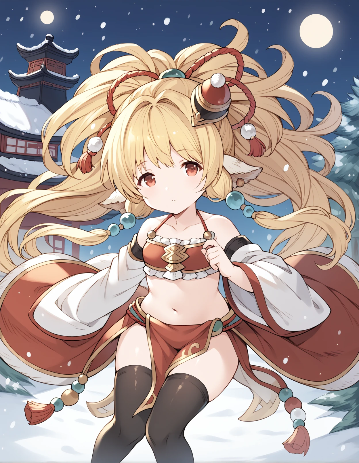 Christmas:gbfmahirasnow, mahira \(granblue fantasy\), 1girl, harvin, blonde hair, hair ornament, long hair, very long hair, twintails, twin braids, animal ears, red eyes, white dress, fur trim, red ribbon, wings, long sleeves, white pantyhose, shoes