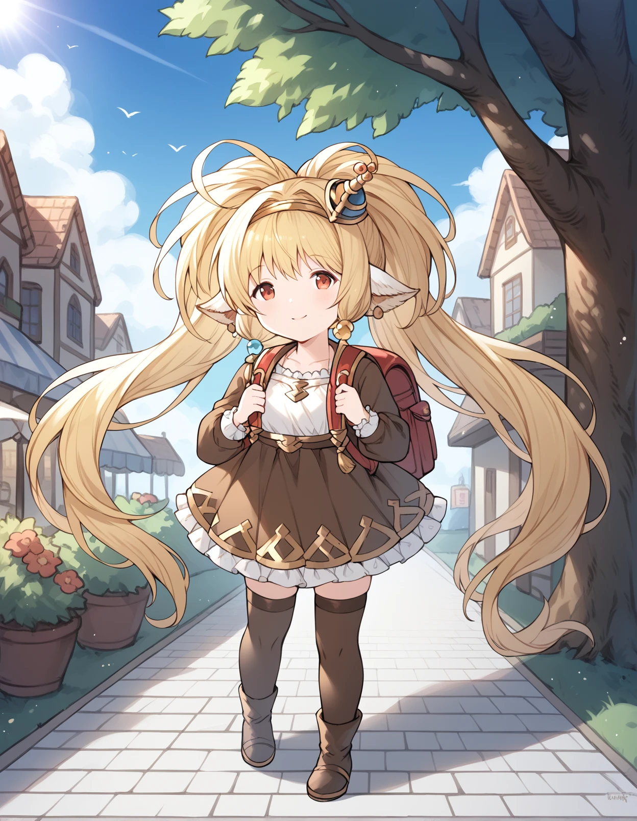 Alternate Costume:gbfmahiraalt, mahira \(granblue fantasy\), 1girl, harvin, blonde hair, hair ornament, jewelry, long hair, very long hair, animal ears, red eyes, brown dress, long sleeves, frilled skirt, backpack, brown thighhighs, boots