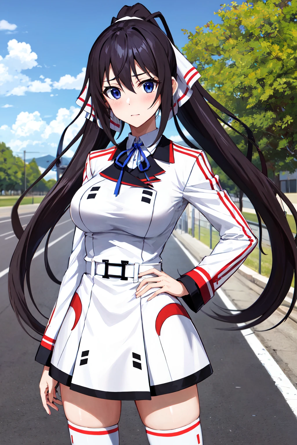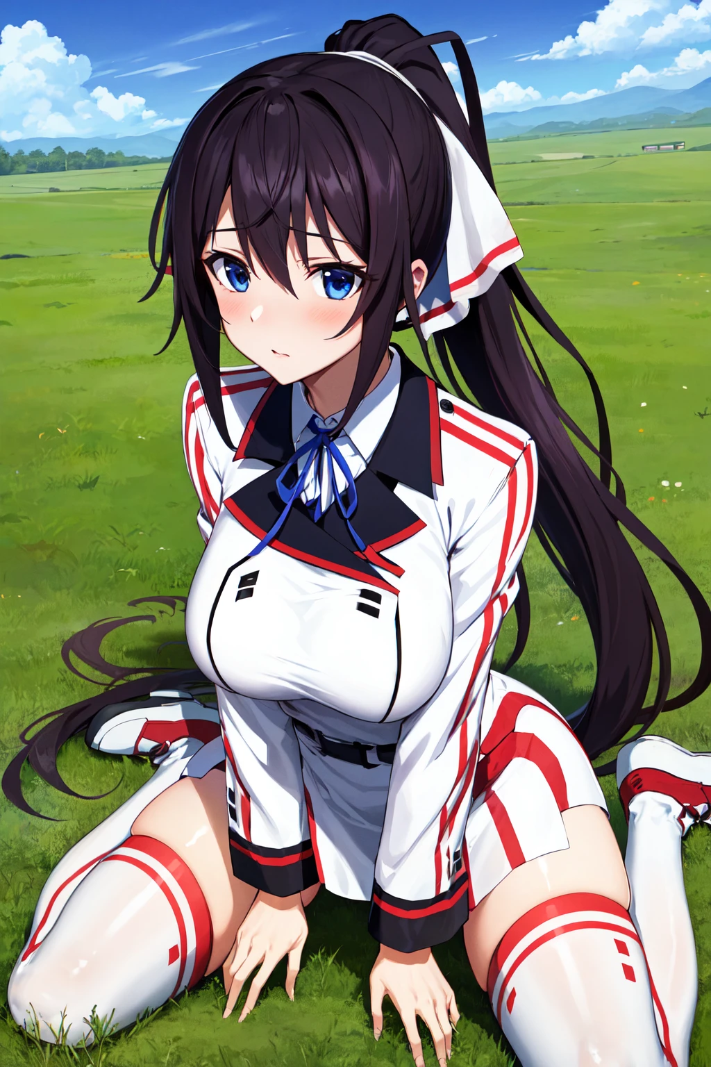 aahouki, very long hair, black hair, high ponytail, split ponytail, hair ribbon, green ribbon, school uniform, neck ribbon, white jacket, white dress, long sleeves, white thighhighs
