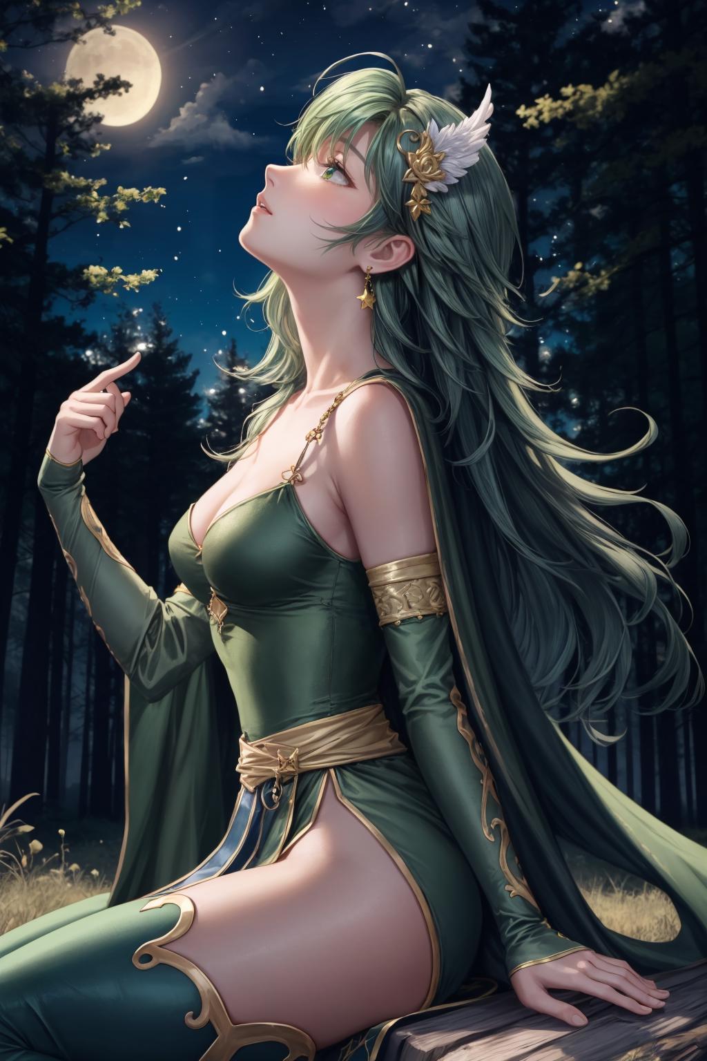green cape, hair ornament, green leotard, belt, detached sleeves, thigh boots