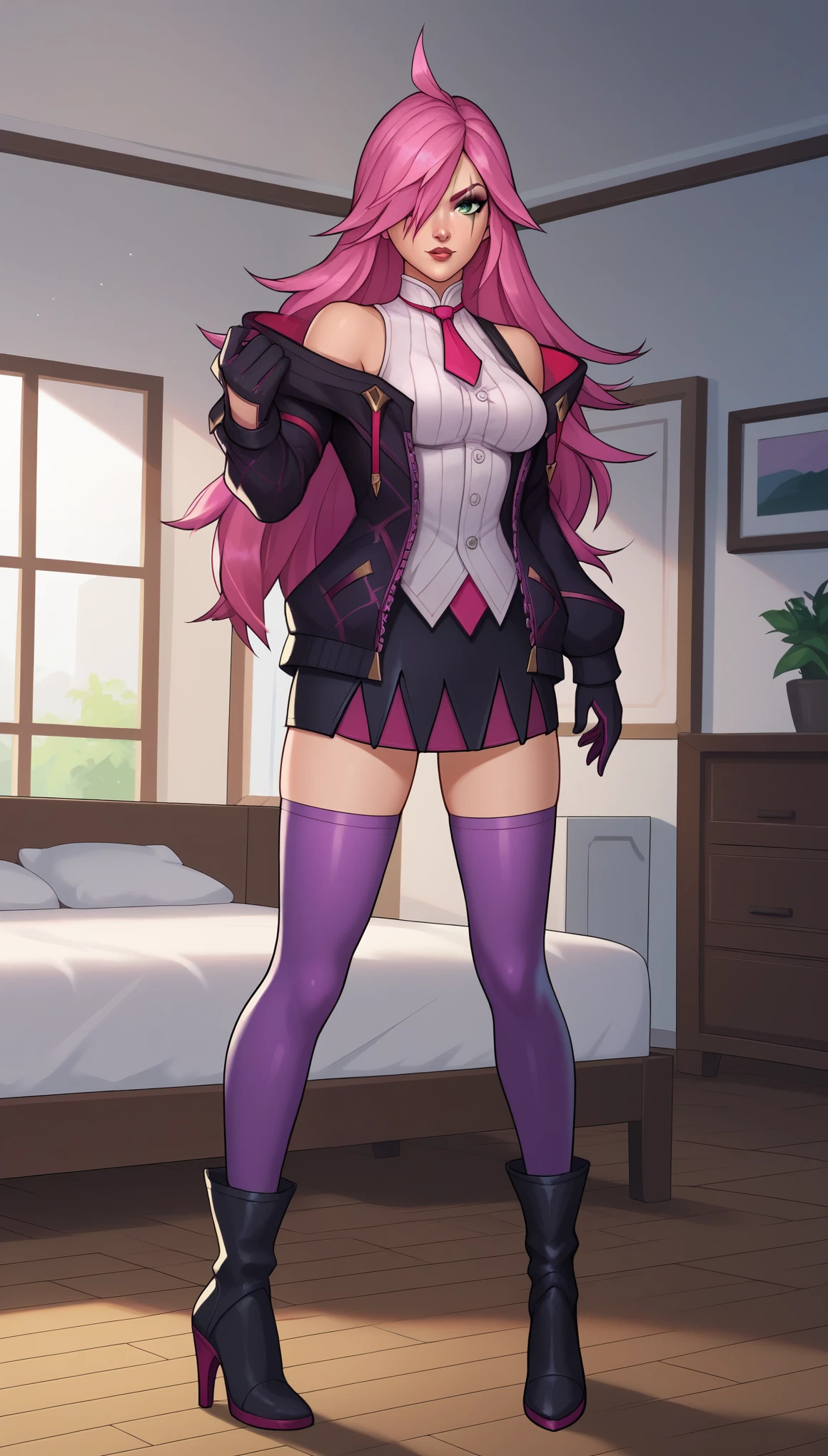 KatarinaBAXL, katarina \(league of legends\), scar across eye, green eyes, pink hair, long hair, hair over one eye, ahoge, medium breasts, bare shoulders, open jacket, black jacket, pink necktie, white shirt, black gloves, black skirt, purple thighhighs, black thighhigh, multicolored thighhighs, black boots, high heels