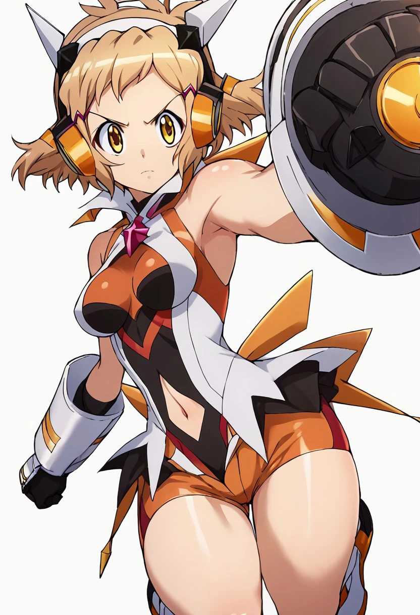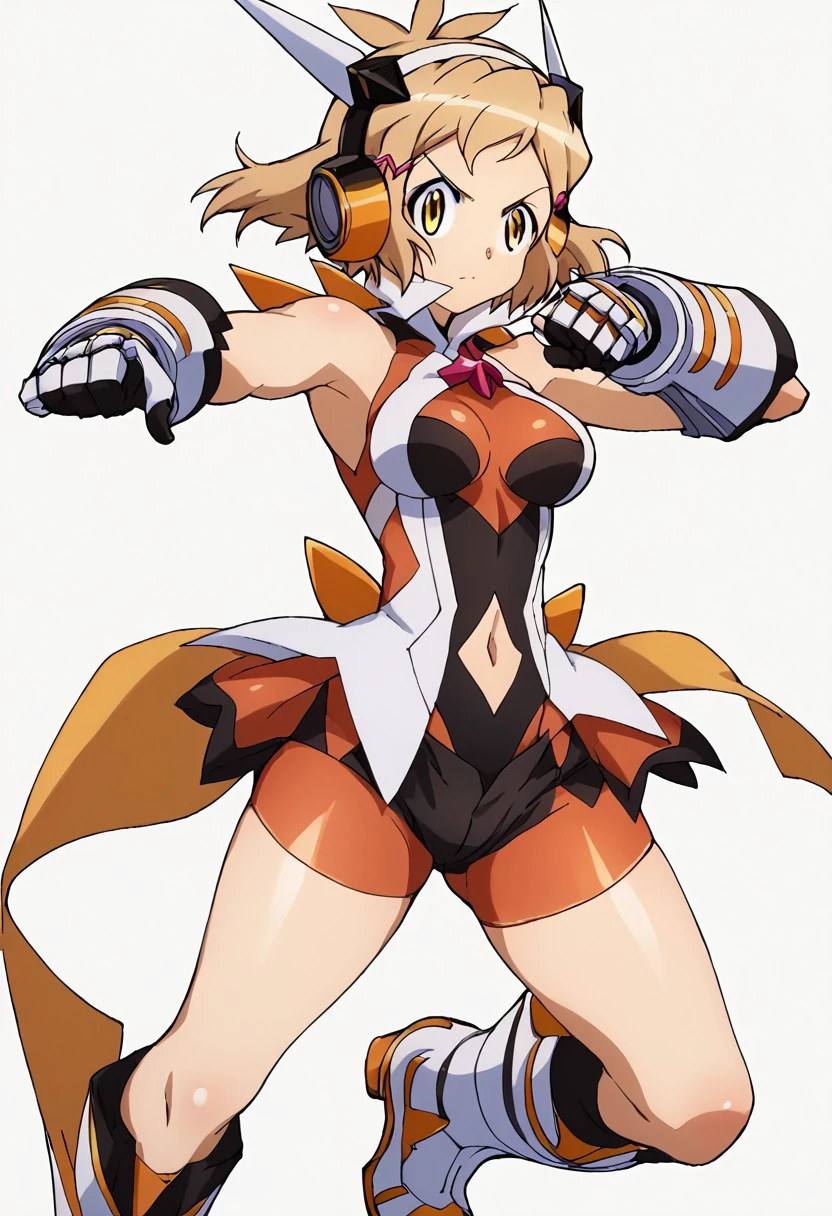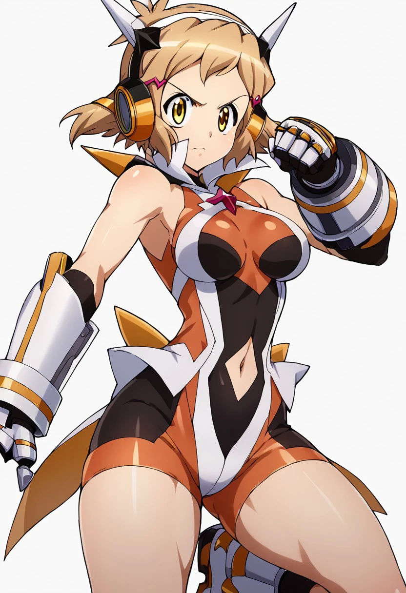 Gloves, leotard, boots, headphones, gauntlets,(navel cutout), shorts