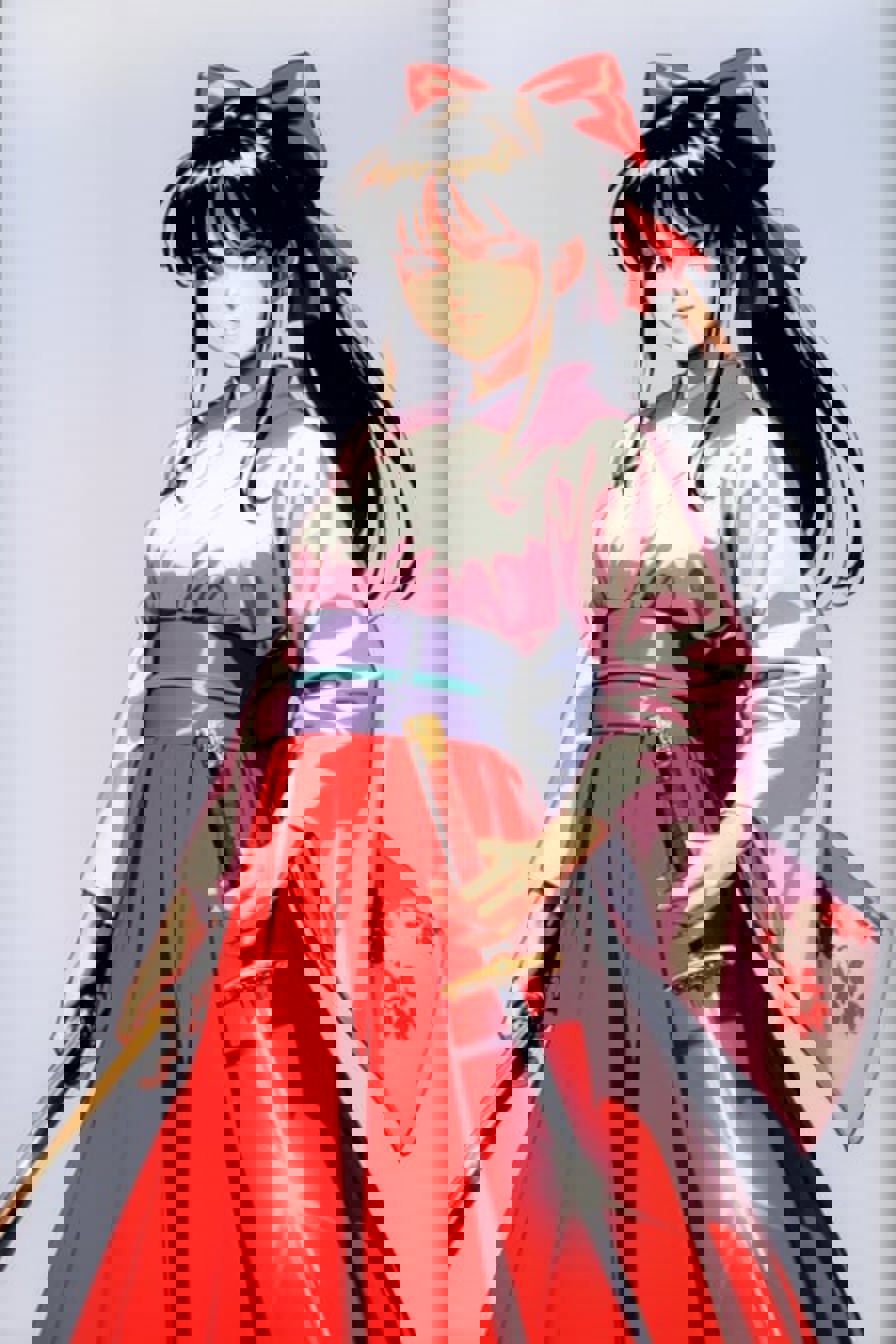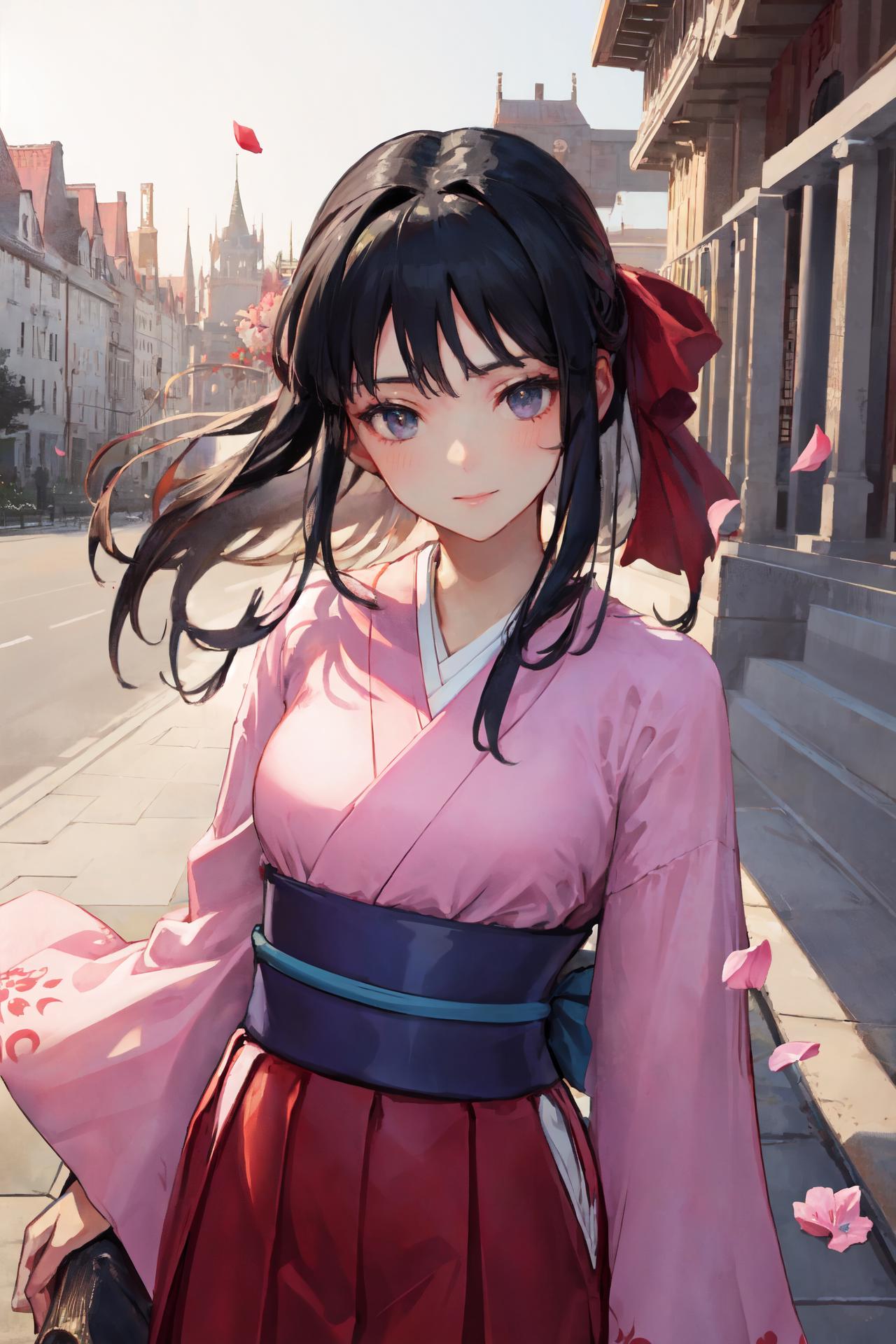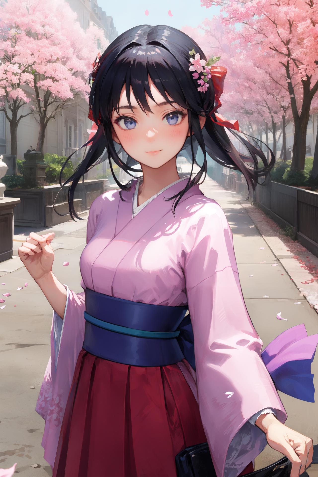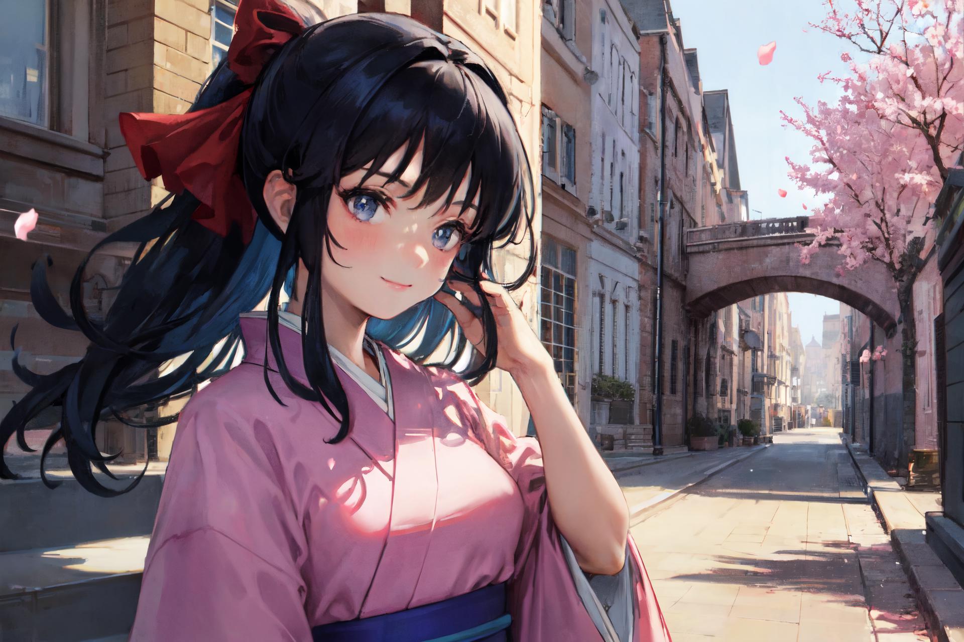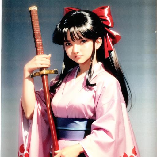 (1990s \(style\):1.2),sakura shinguuji (sakure wars), 1girl, umbrella, solo, japanese clothes, long hair, flower, oil-paper umbrella, kimono, hydrangea, bow