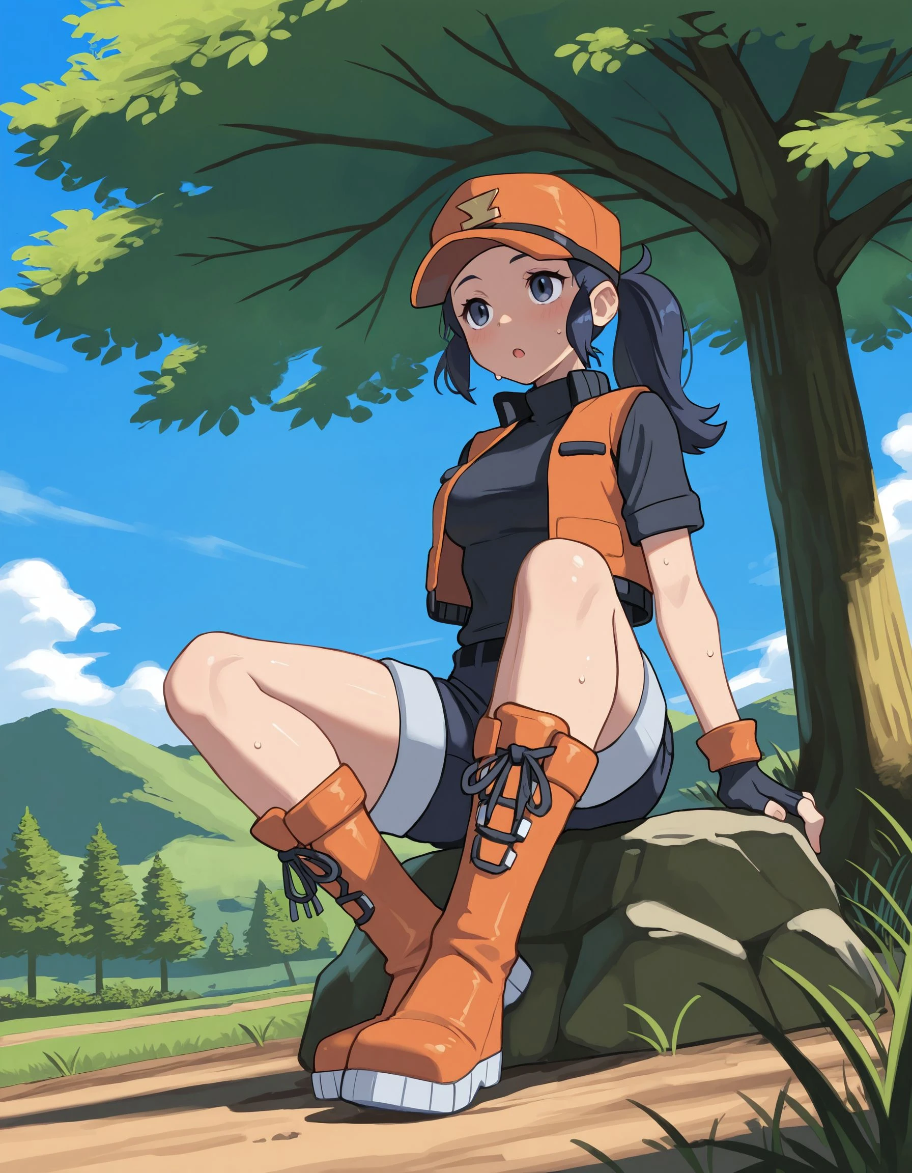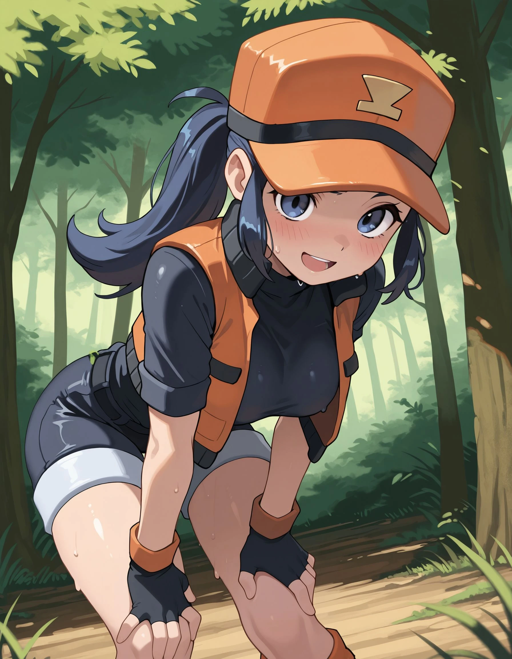 pokemonranger oras,baseball cap,fingerless gloves,orange vest,black shirt,black shorts,orange boots