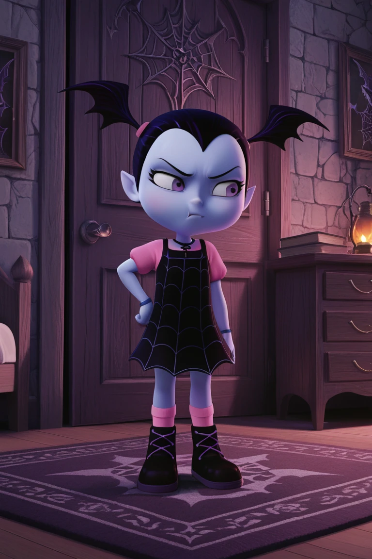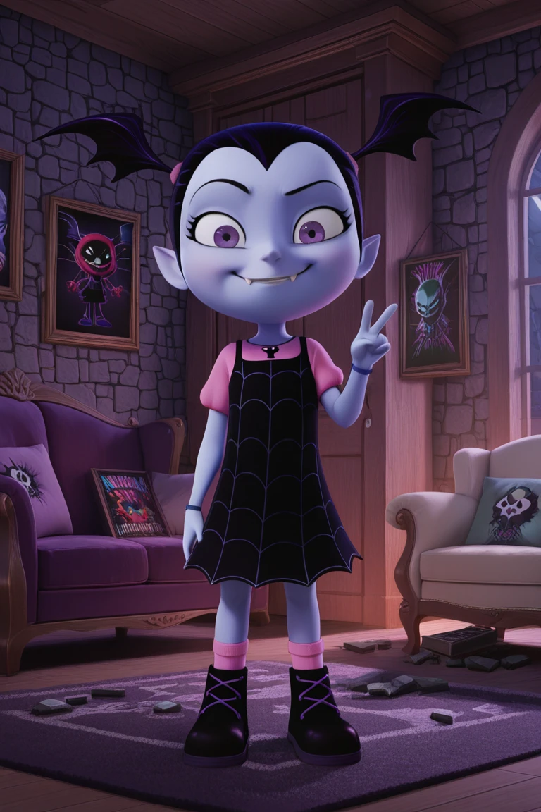vampirina, black hair, head wings, purple eyes, fangs, colored skin, dress