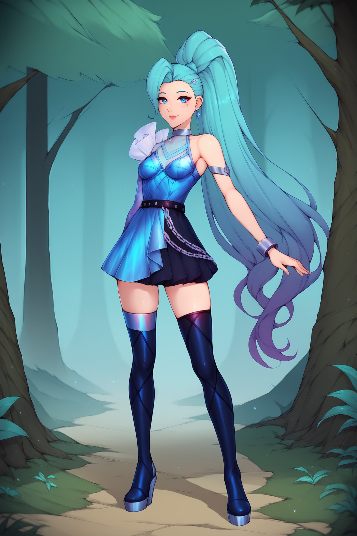 SeraphineKDAAOXL, K/DA (league of legends), blue eyes, aqua hair, long hair, ponytail, bangs, medium breasts, blue dress, armlet, bracelet, black belt, black skirt, chain, black thigh boots