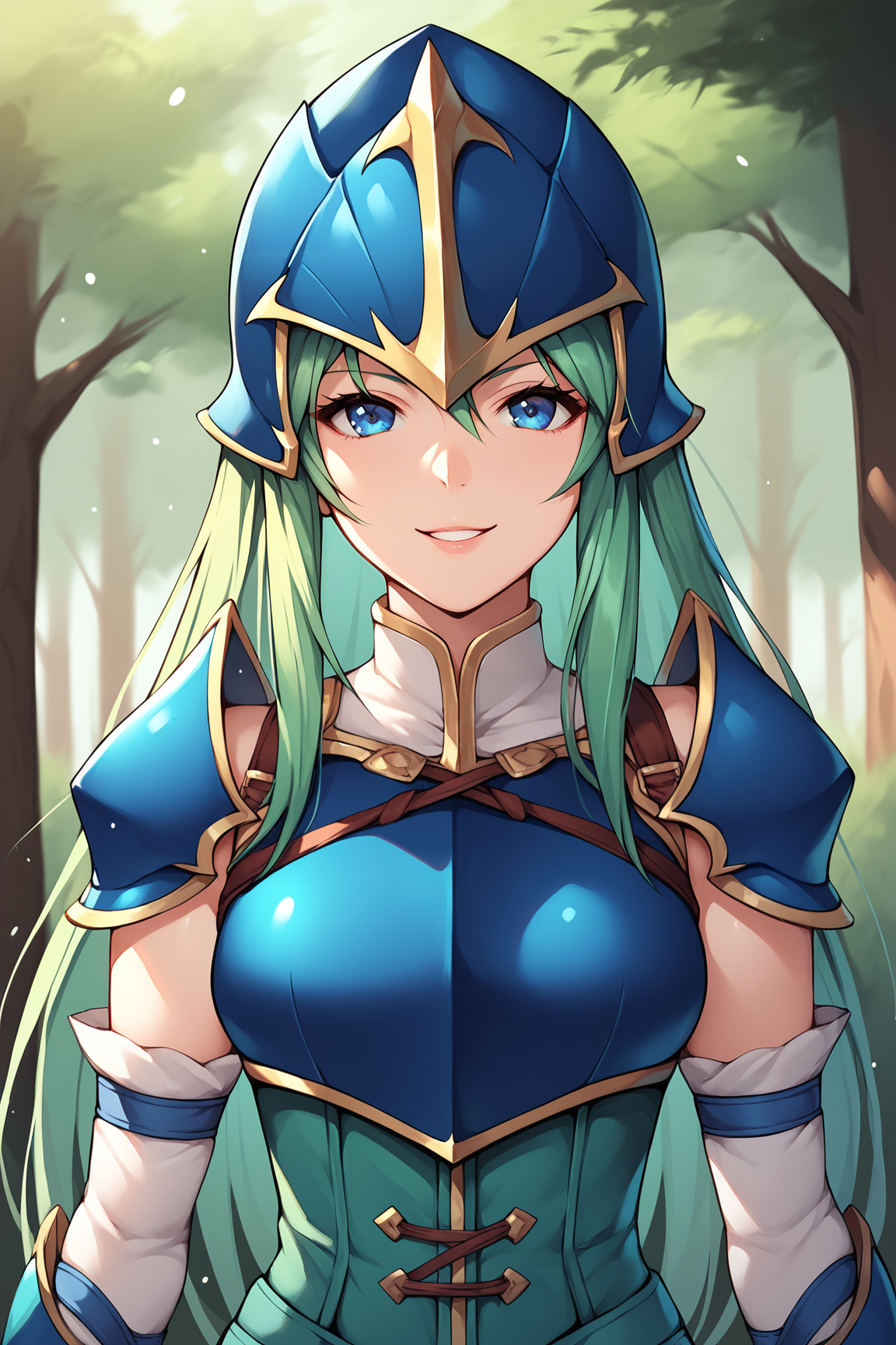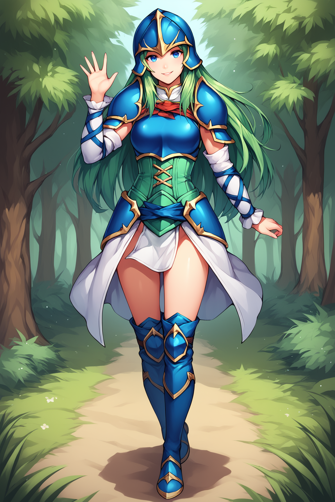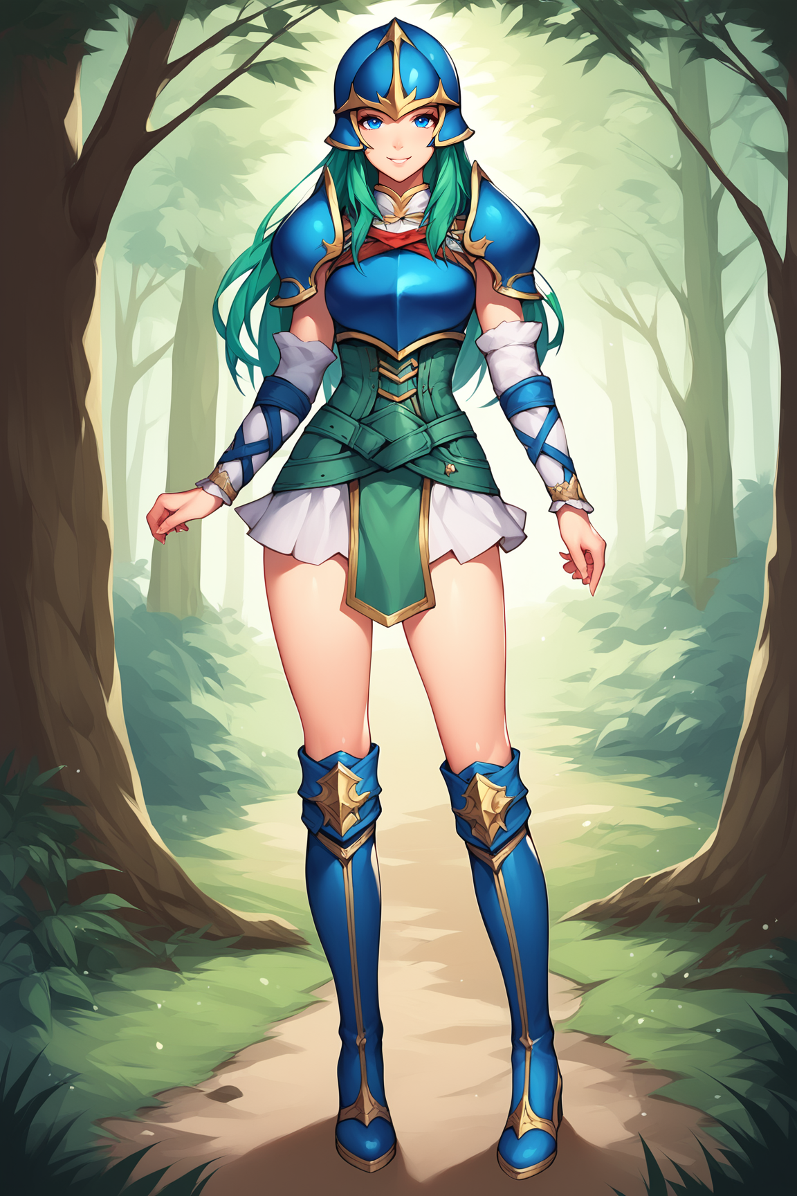NepheneeFEXL, blue eyes, green hair, long hair, sidelocks, medium breasts, blue armor, blue helmet, shoulder armor, breastplate, green corset, green loincloth, white sleeve, detached sleeve, guantlets, white skirt, blue thigh boots