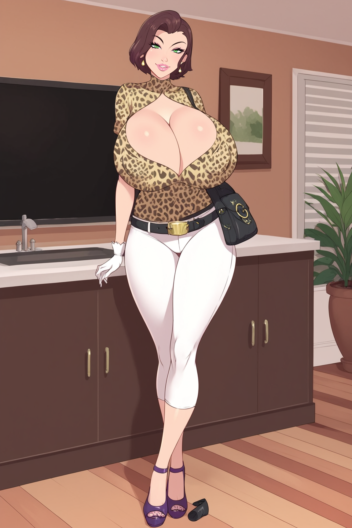 VanessaVanderbuiltMFGXL, pink lips, green eyes, brown hair, short hair, earrings, huge breasts, cleavage cutout, leopard print, shirt, short sleeves, white gloves, black belt, white pants, purple high heels