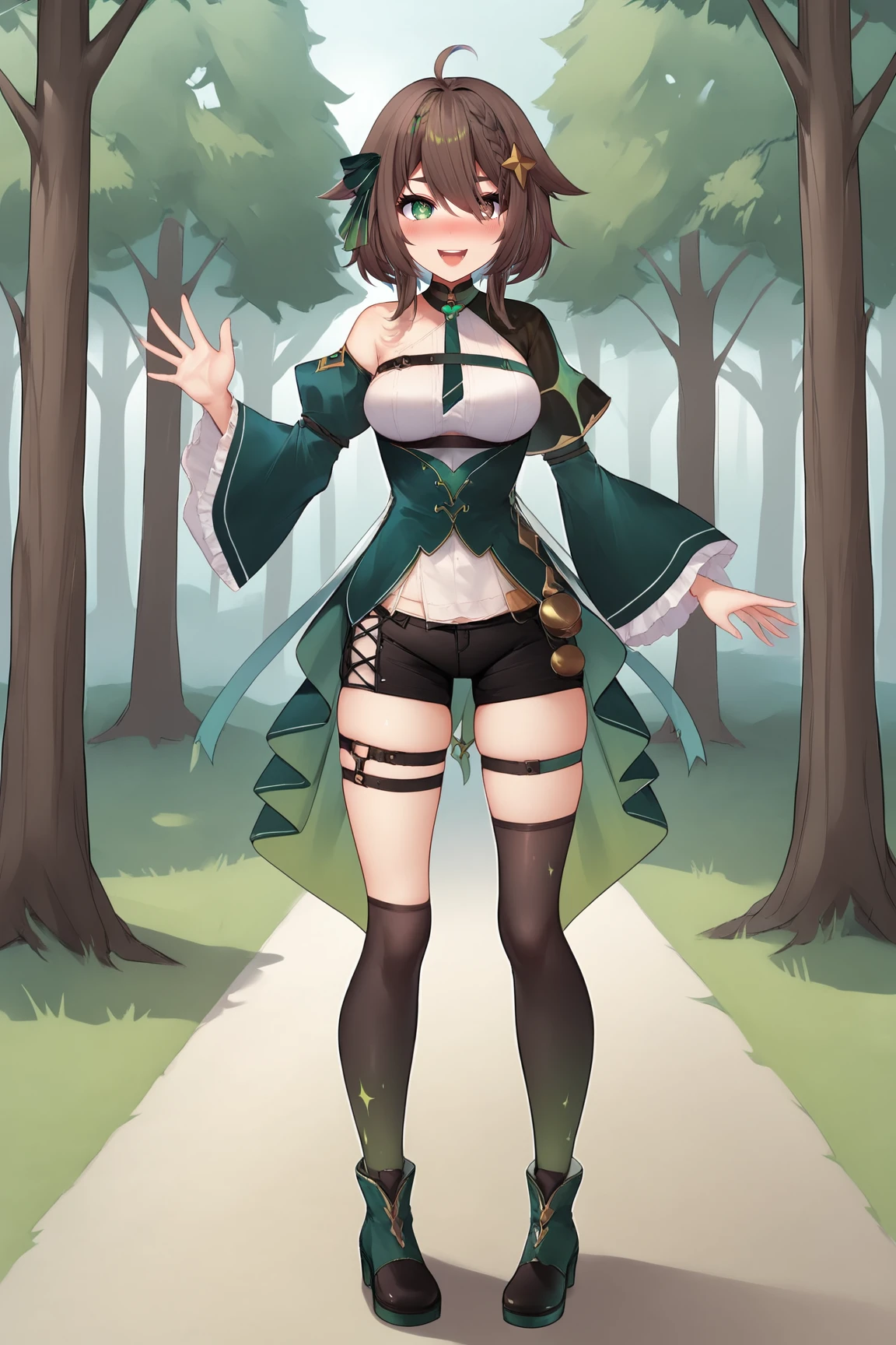 Meica05VTXLv2, heterochromia, green eyes, (brown eye), brown hair, short hair, hair ornament, hair between eyes, braid, ahoge, ribbon hair, green ribbon, ??????????????, green necktie, off shoulder, green dress, long sleeves, black shorts, short shorts, black thighhighs, thigh strap, black shoes