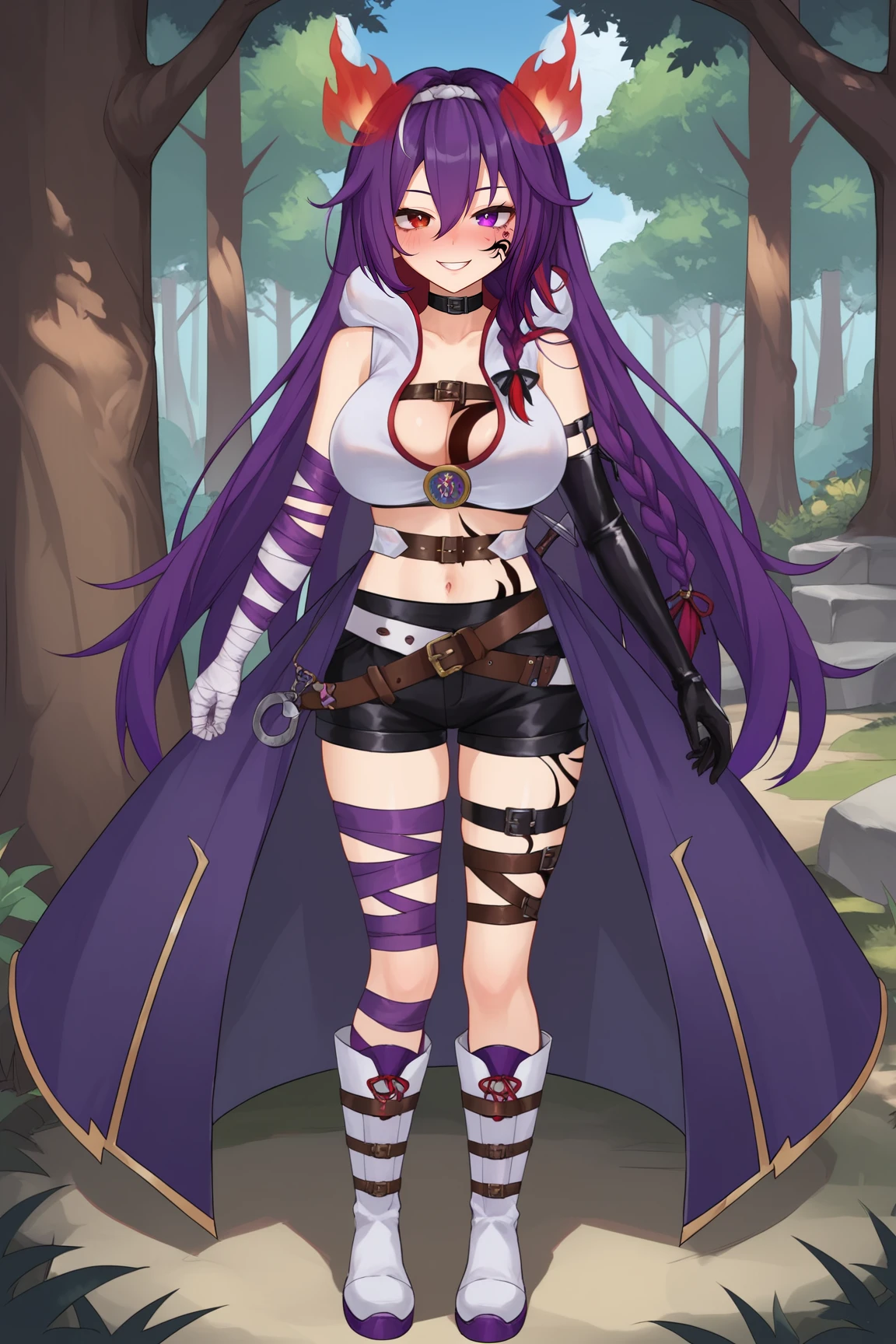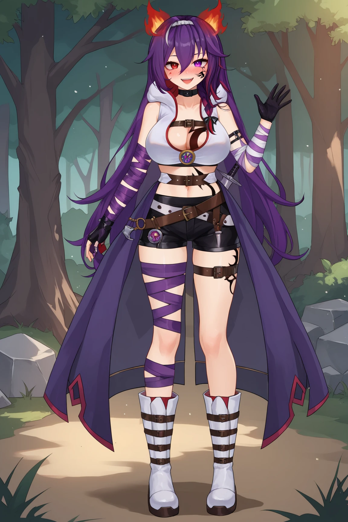 MaiNoboshiVTXL, facial mark, red eyes, (purple eye), heterochromia, purple hair, long hair, red flaming hair, braid, streaked hair, hair between eyes, white hearband, black choker, tattoo, ?????????????, cleavage, white midriff, purple bandaged arm, black elblow glove, brown belt, black shorts, purple bandaged legs, white boots