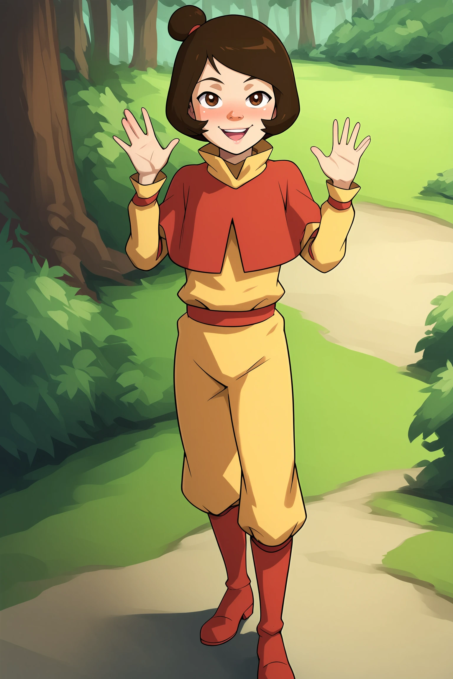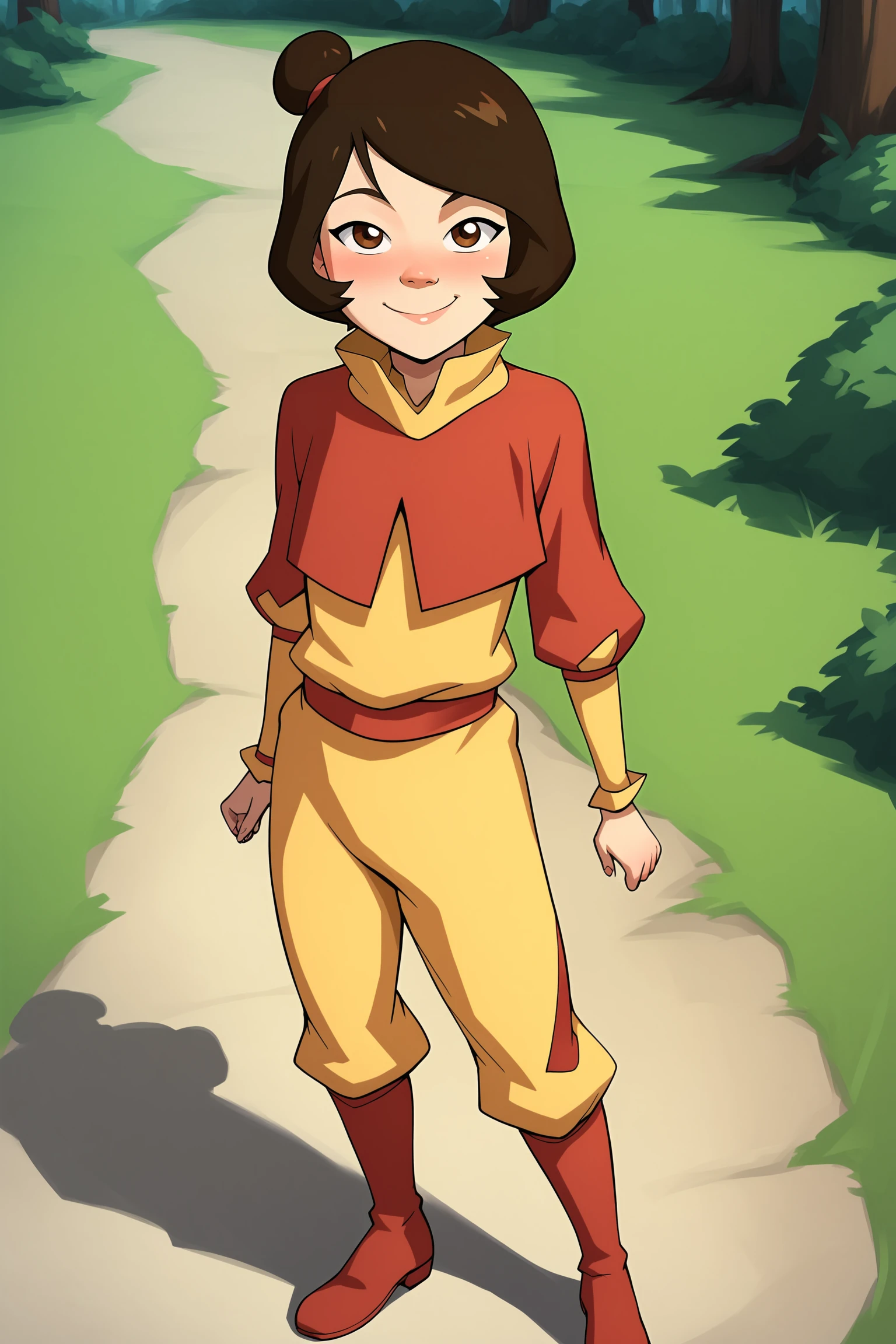 JinoraAvatarPXL, 1girl, brown eyes, brown hair, short hair, single hair bun, flat , red capelet, yellow shirt, long sleeves, red belt, yellow pants, red boots