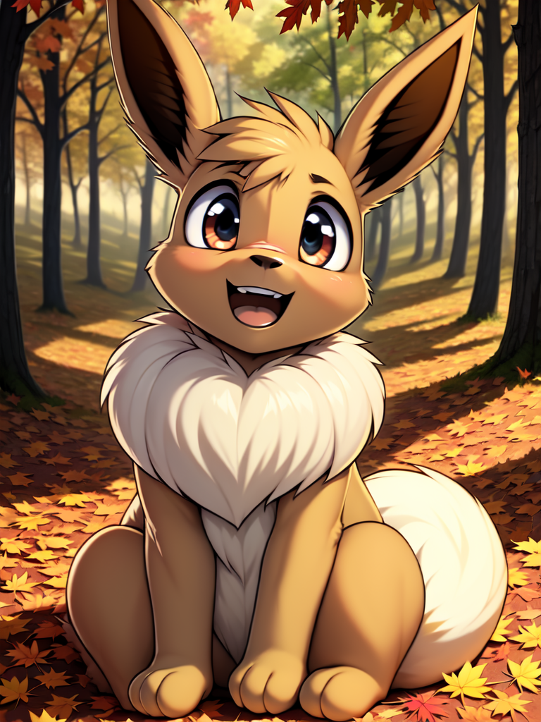 Eevee, Eevee tail, Eevee ears, pawpads, smile, open mouth, sitting, looking at viewer, autumn, forest, trees, <lora:Eevee V1:0.7>Negative prompt