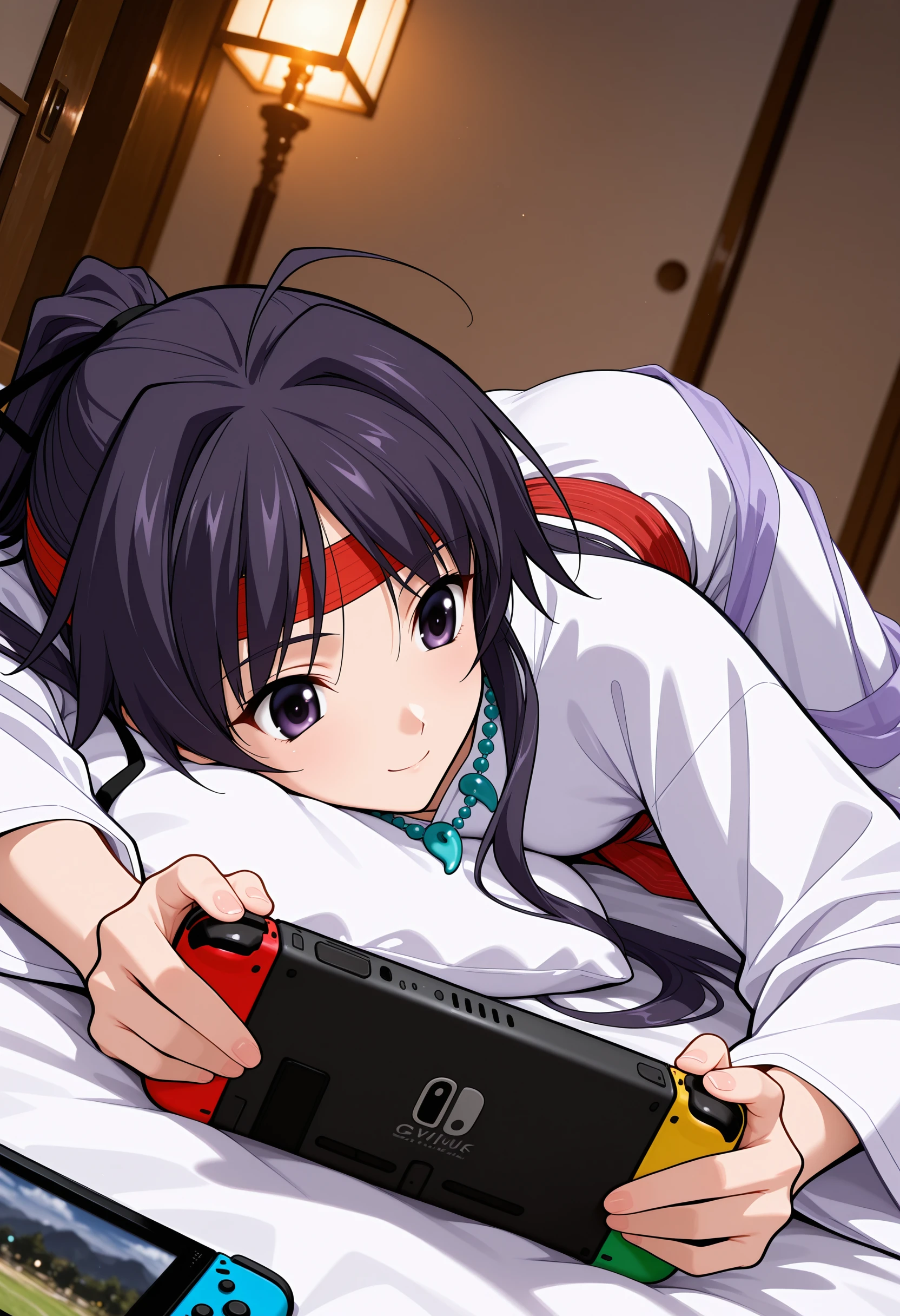 suzuna takano \(memories off 2\), takanoheadband, white japanese clothes, red headband, wide sleeves, red sash, purple see-through streamers, magatama necklace, black hair ribbon, ahoge, ponytail, purple eyes,