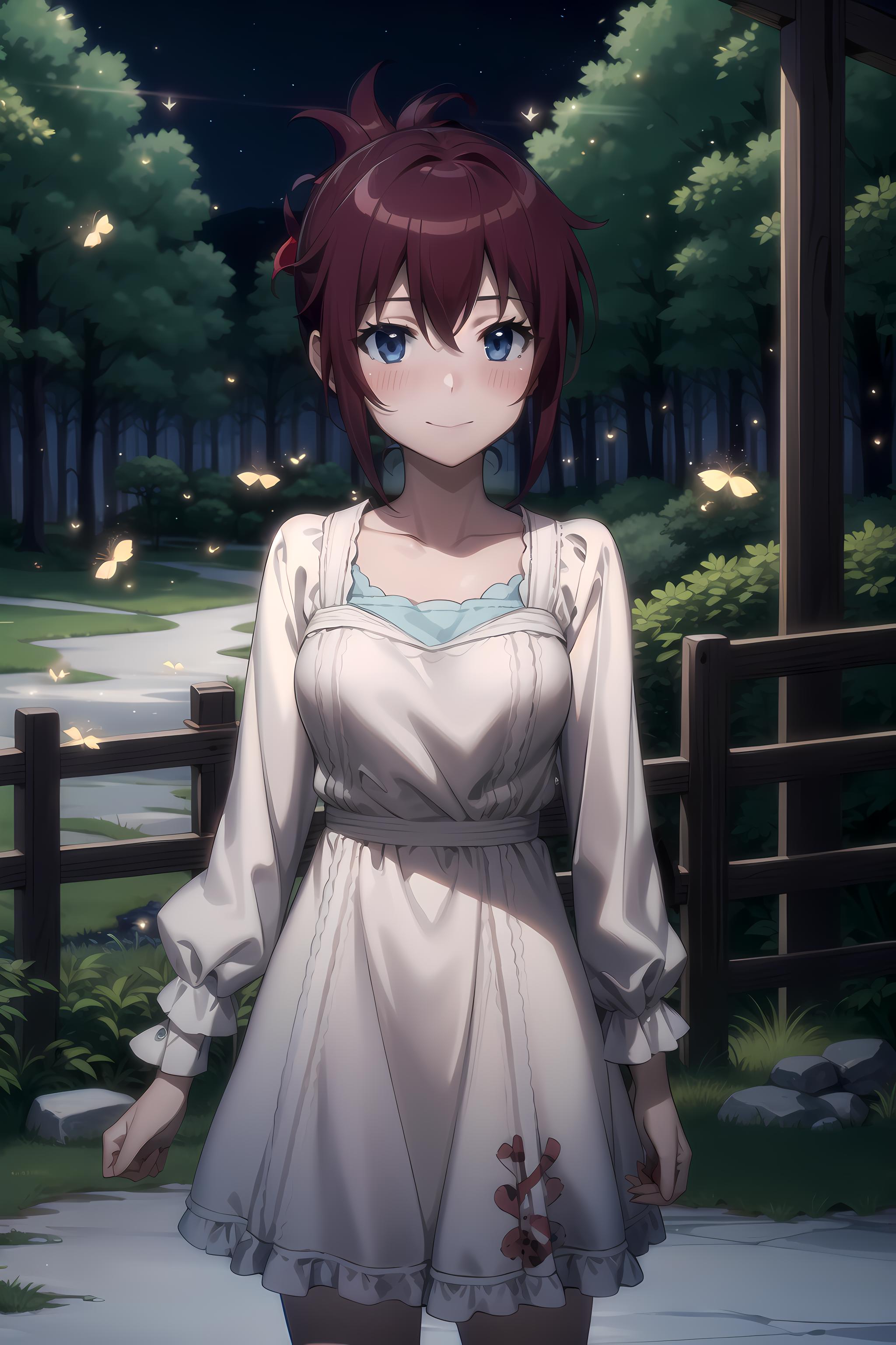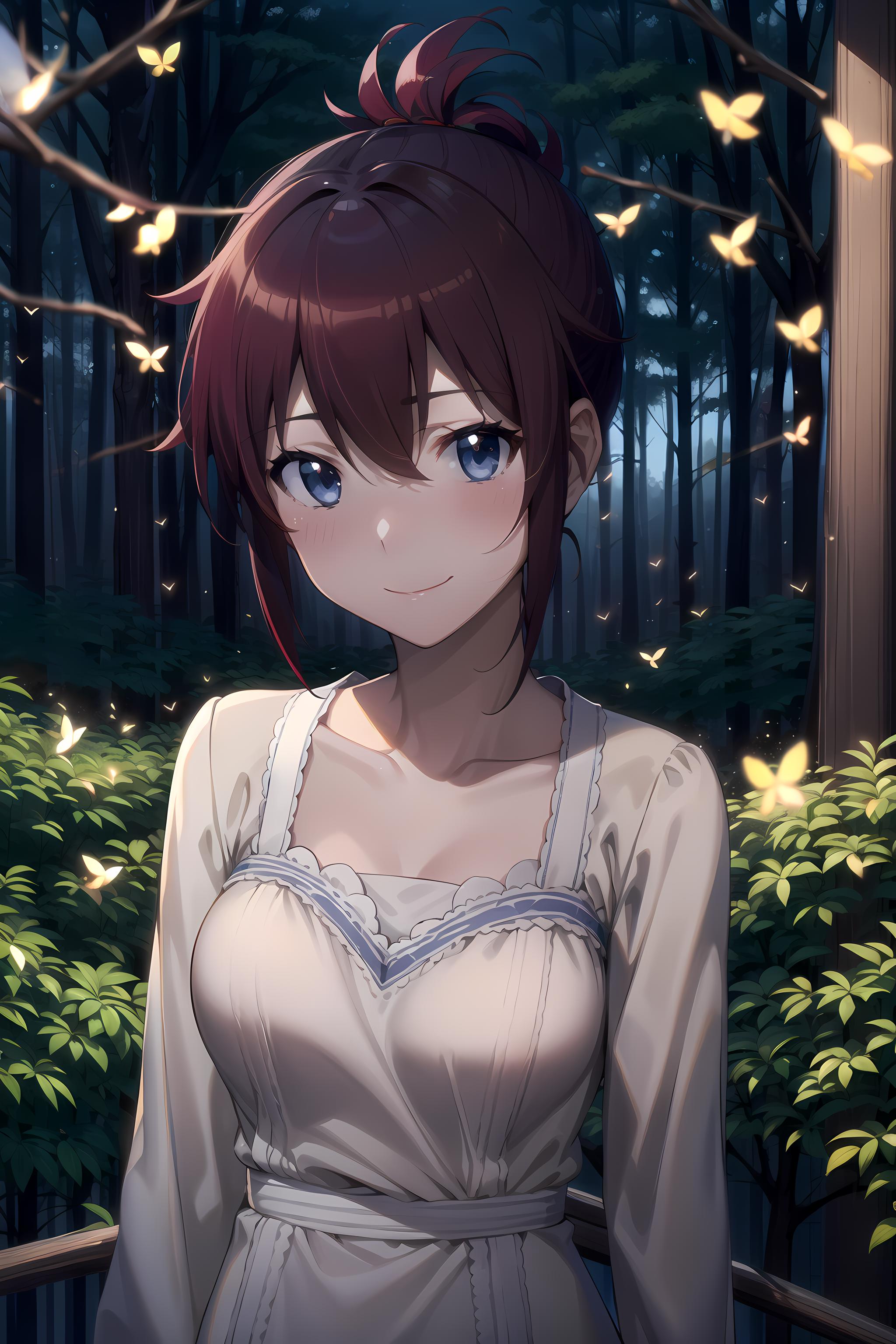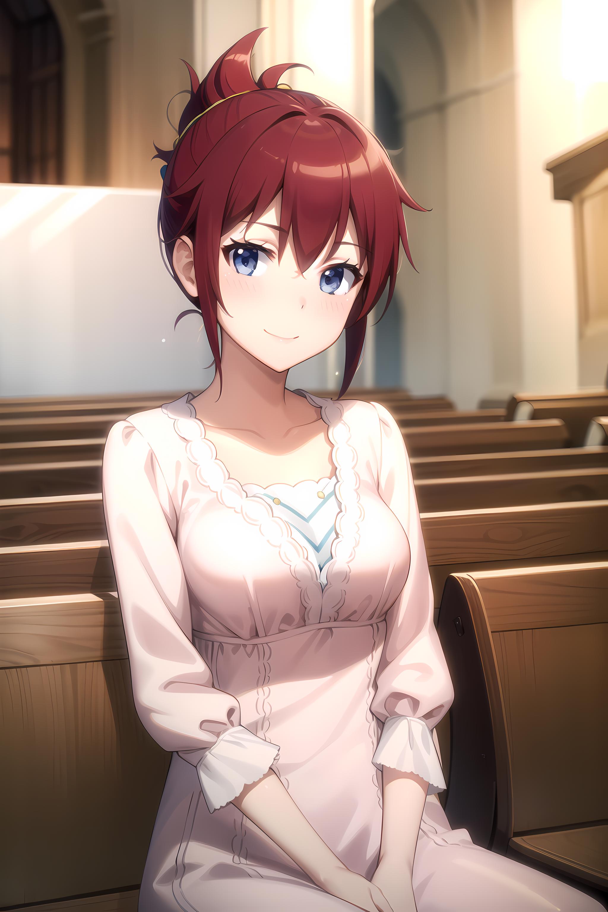 blue eyes, red hair, short hair, folded ponytail