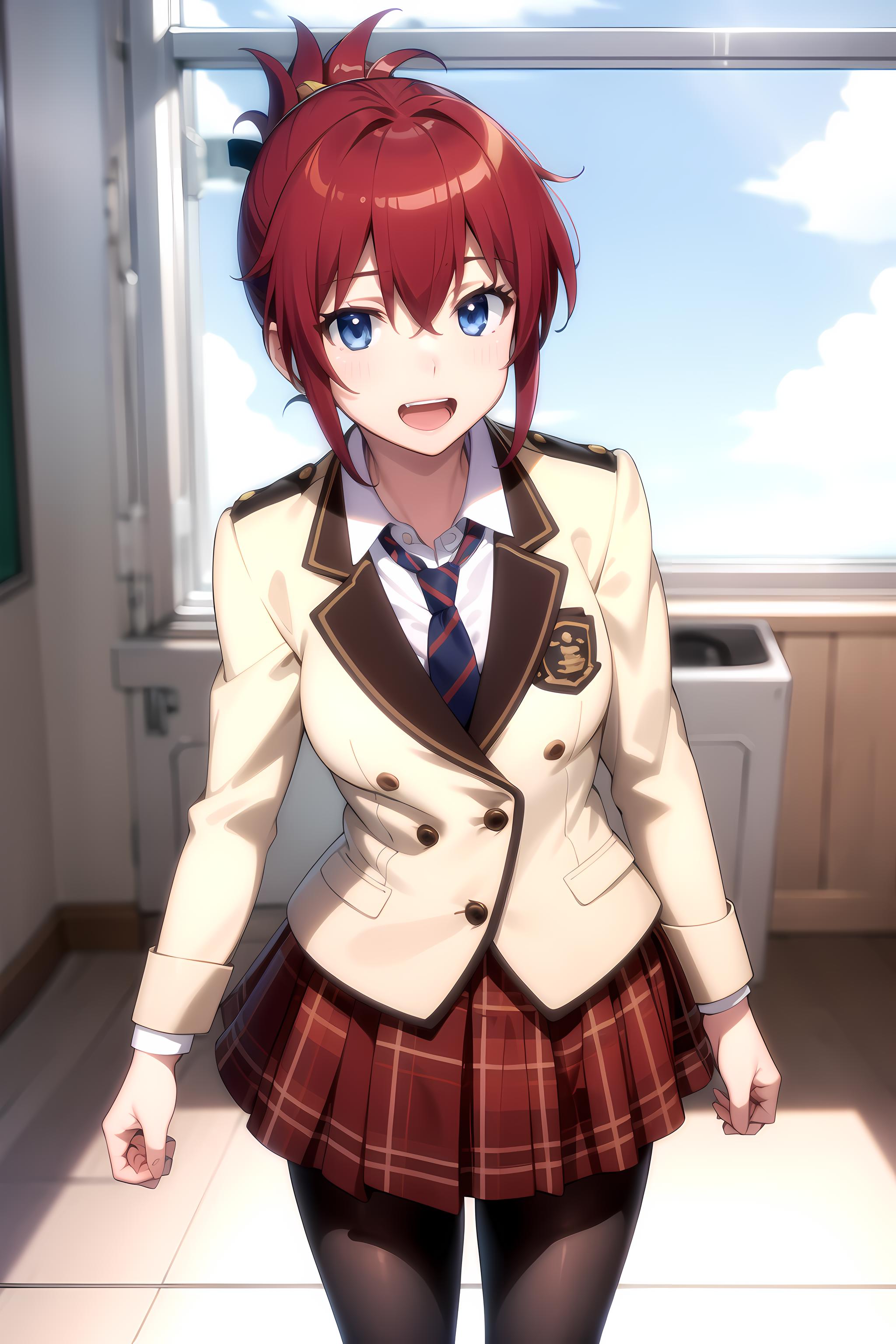 school uniform, blazer, necktie, red skirt, pantyhose