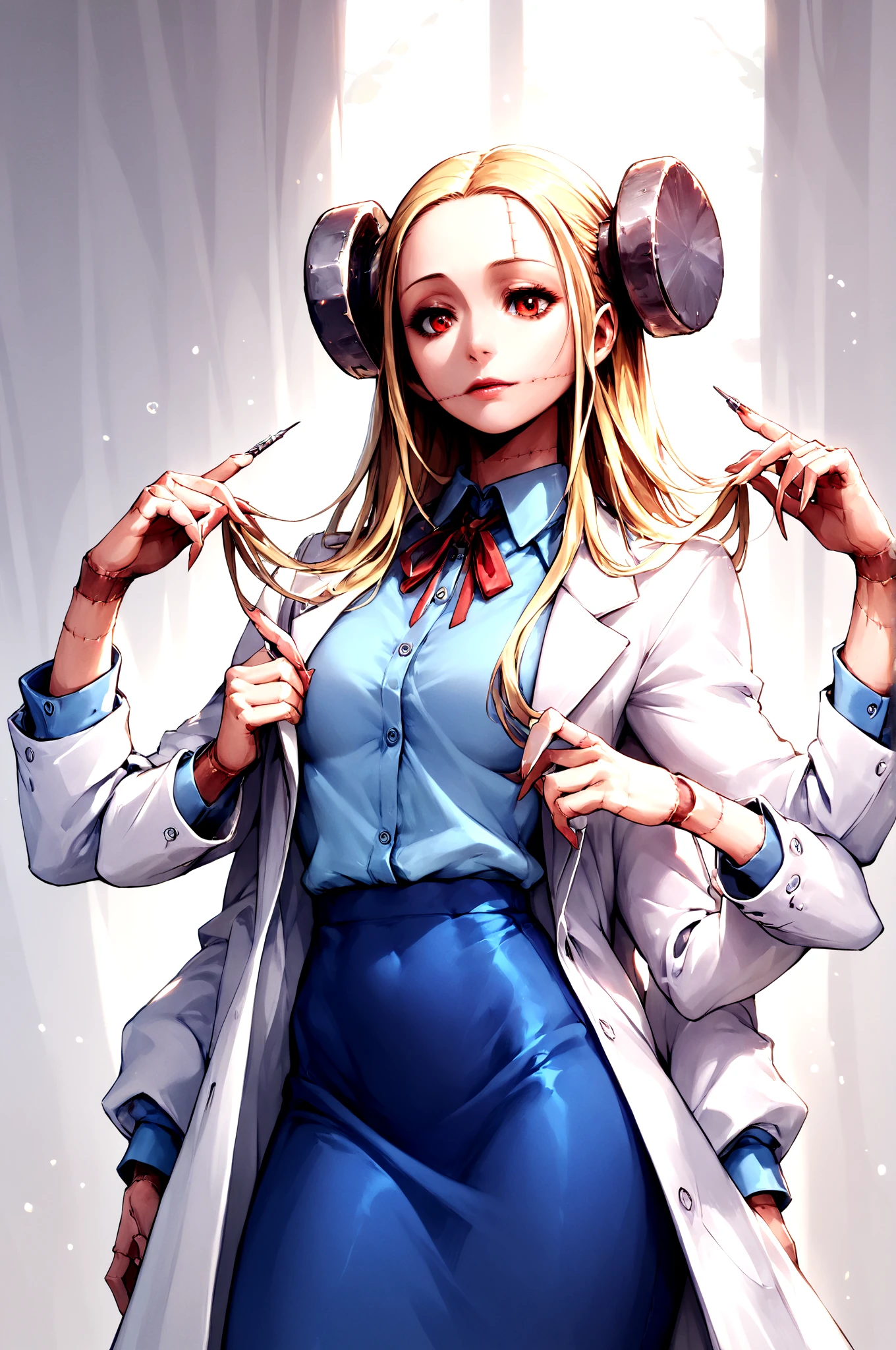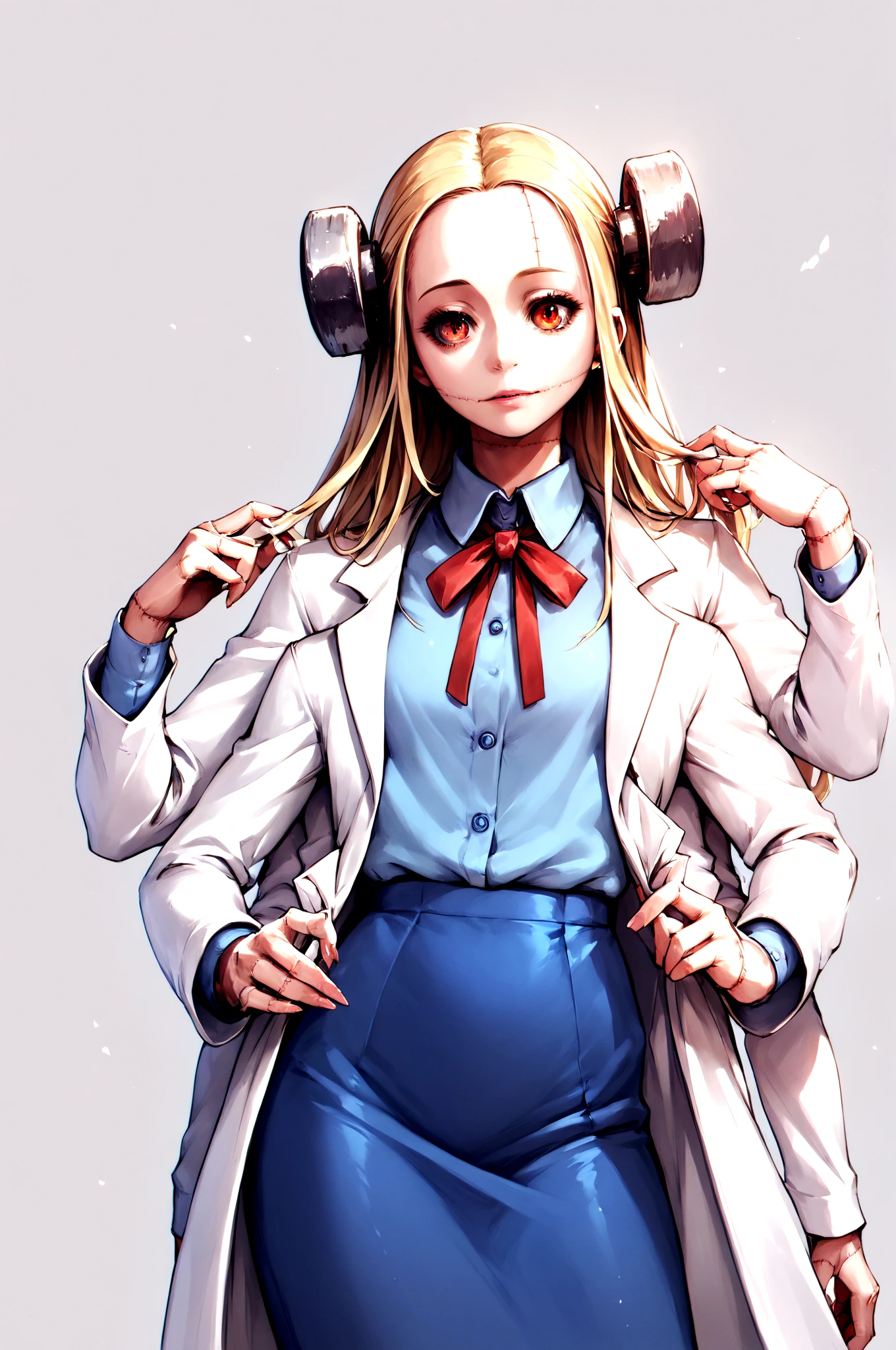 More or less canon look: long_hair, blonde_hair, blue_skirt, labcoat, red ribbon, white_shirt, extra arms