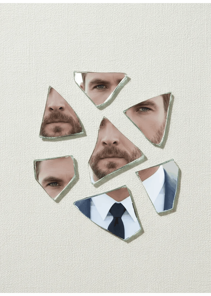 Retrato de cerca revelado a través de fragmentos de vidrio dispersos, con reflejos de luz que resaltan lo intrincado, detalles fragmentados.