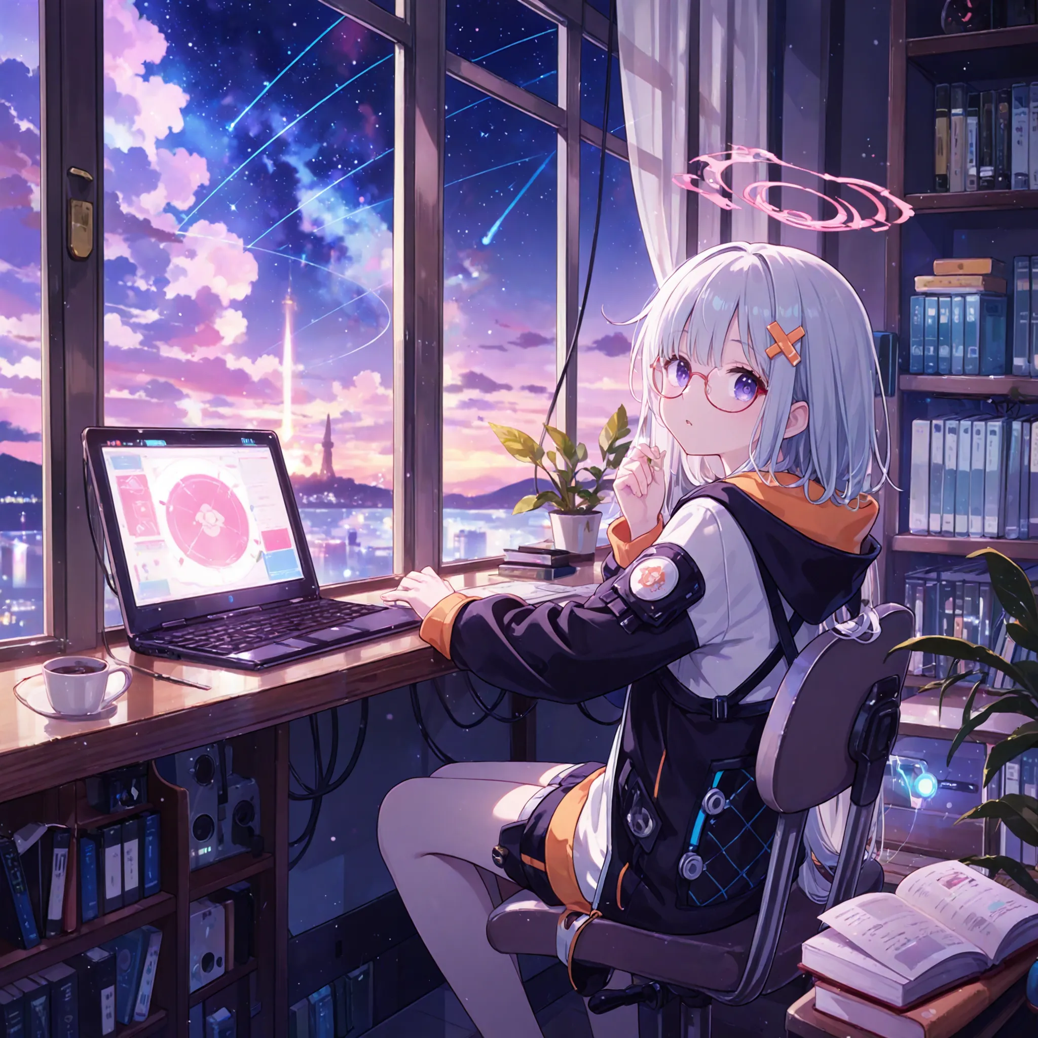 Bienvenido a Scholar's Corner, tu estudio personal para crear el perfecto, retrato de estudio acogedor.Nosotros proporcionamos la estrella: una encantadora y estudiosa erudita, siempre enfocada en su trabajo. Usted le proporciona su mundo. Design a magical liesary, una nave espacial futurista, o una habitación de dormitorio soleada. Describe su atuendo, la vista desde su ventana, y el estado de ánimo de su sesión de estudio, and our creative engine will esing your vision to life in a beautiful, Suave, Estilo de arte pastel.Su enfoque es constante. Su mundo es tuyo para diseñar.