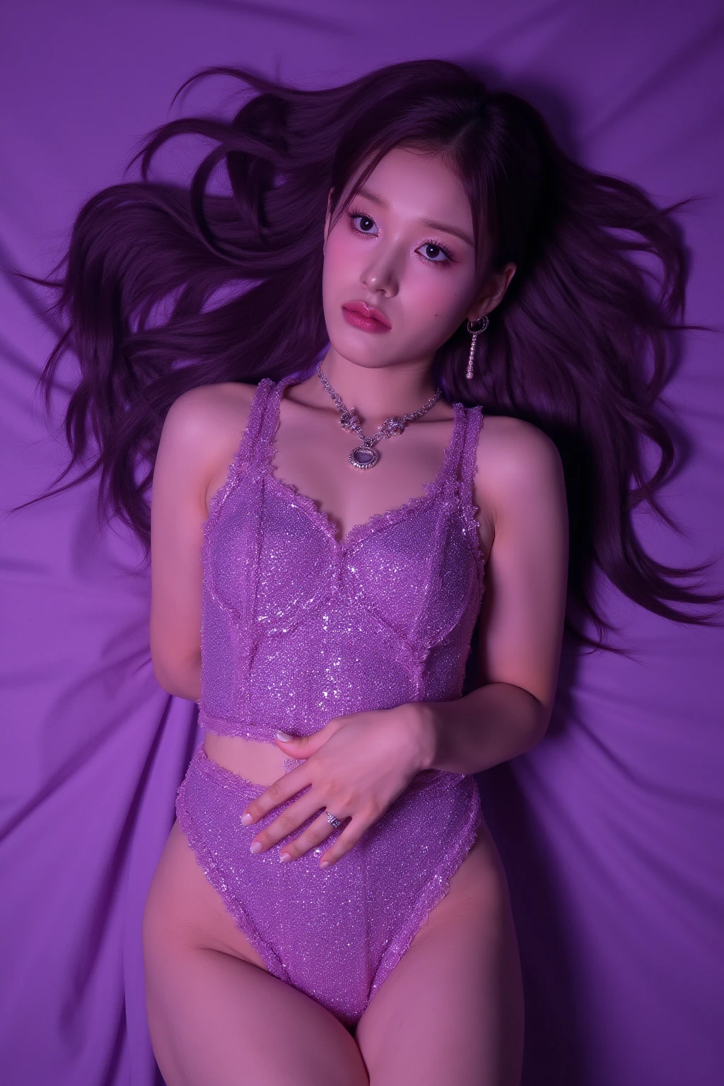 Arafed woman with purple hair sitting on a bed in a green dress