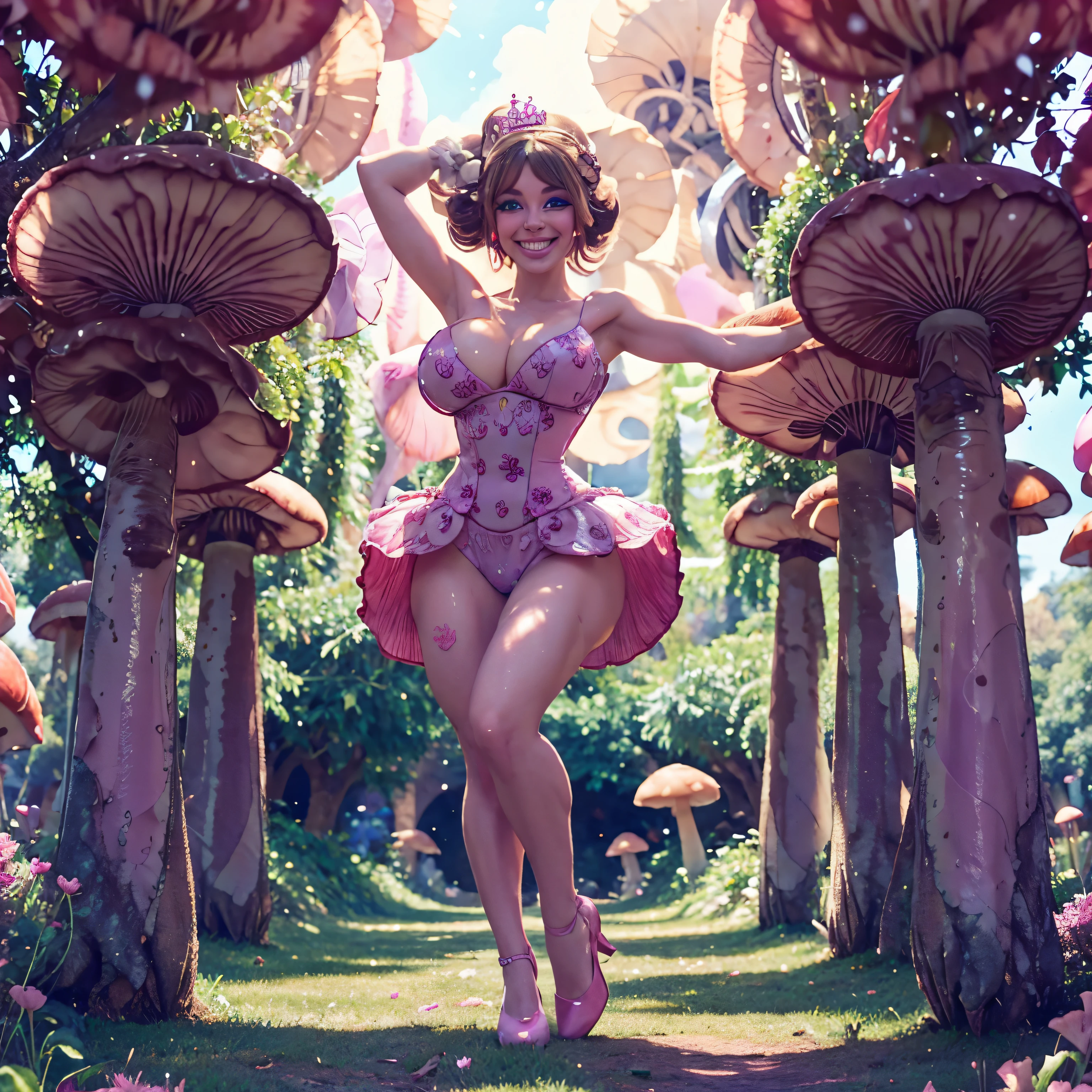 There is a woman in a pink dress posing in front of a mushroom