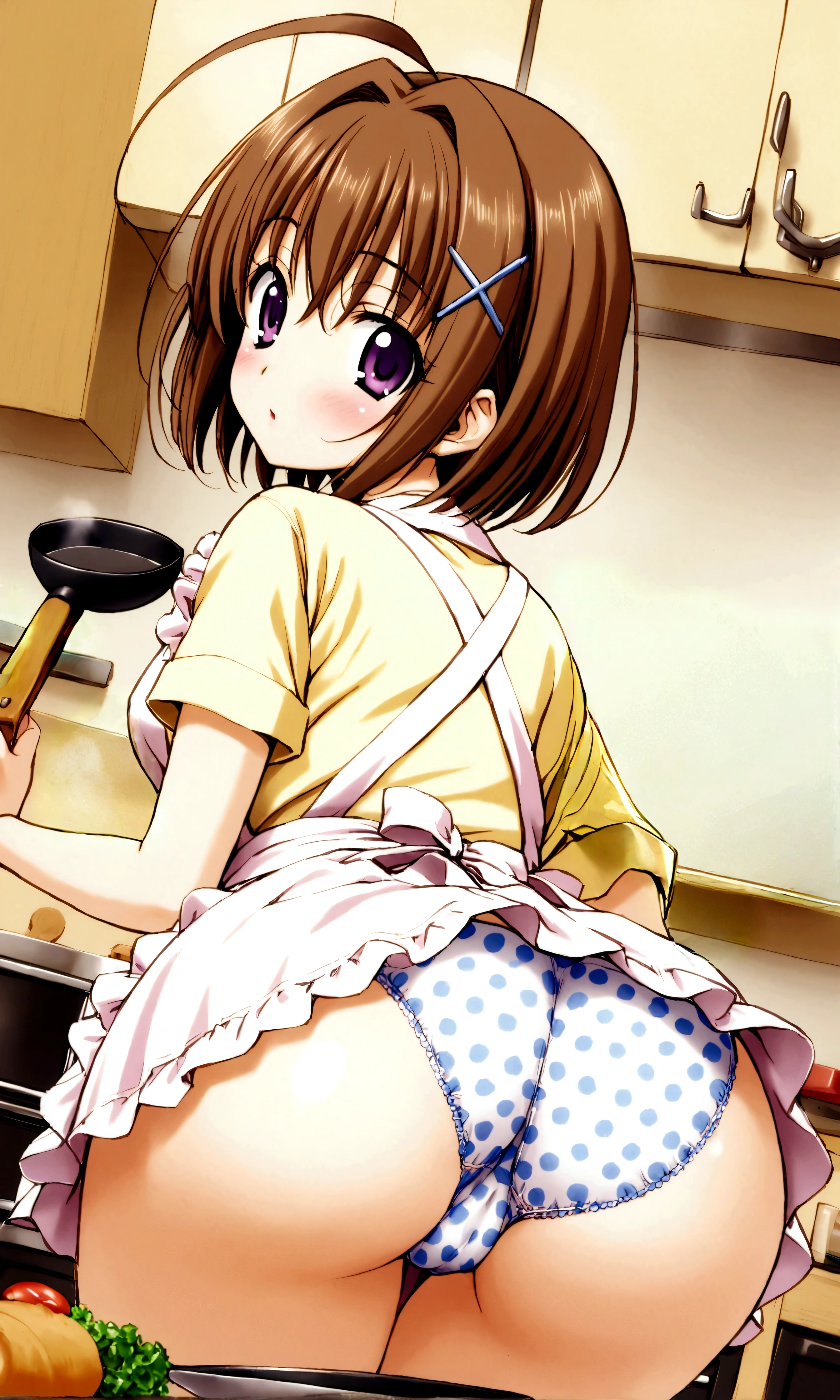 Anime girl in apron cooking in kitchen with carrots and vegetables
