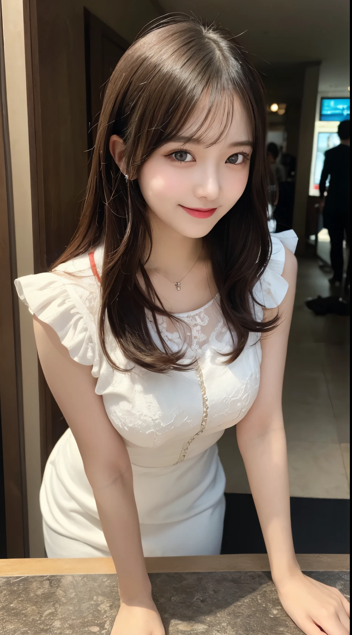 Tabletop, Highest quality, shape, Very detailed, finely, High resolution, 8k wallpaper, 完璧なダイナミックな構shape, Beautiful and detailed,ランダムなcute髪,,Natural color lip, Bold ???? pose,smile、20-year-old girl、cute、Looking into the camera,Always blur the background,Perfect and beautiful face,Slim face and figure,Big eyes、Putting on gal makeup,Small face,Shooting from below、smile,Blurred Background,Elegant feminine face、Cyberpunk Fashion、smile、Cosplayers(All-over embroidered side slit tight long length  cheongsam dress)