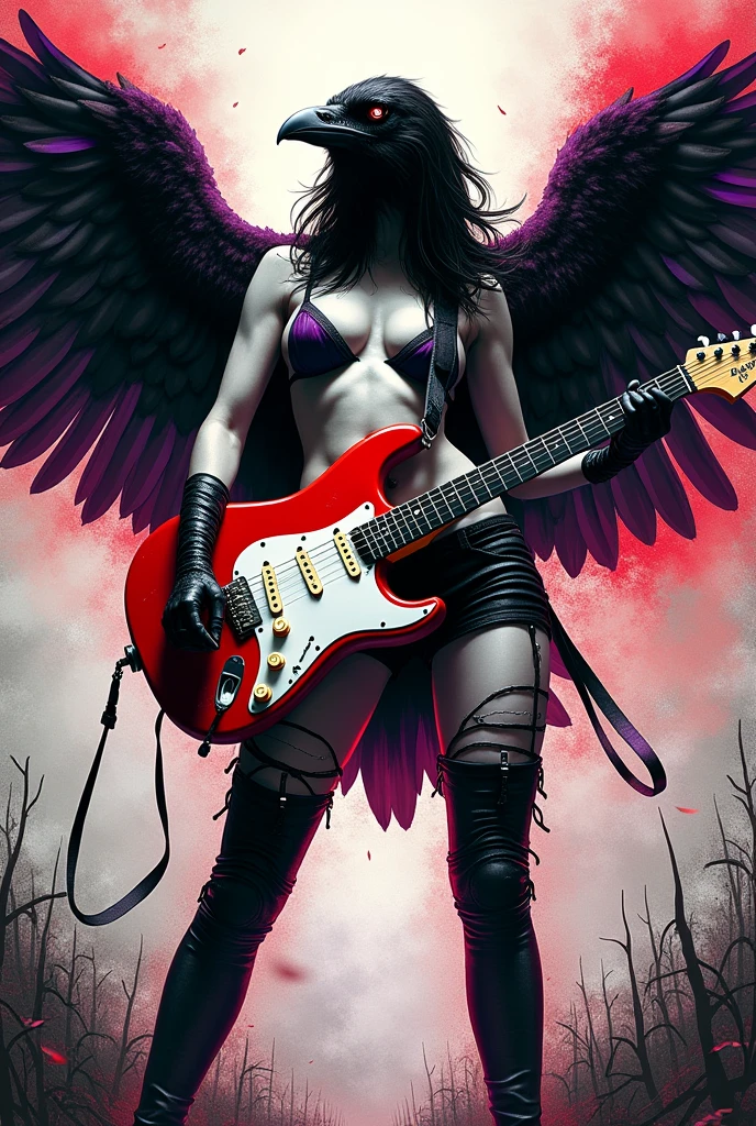 holding a Fender Stratocaster guitar adorned with red and purple tones