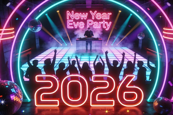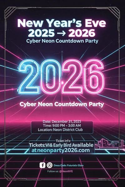 Turn 2026 New Year party flyer ideas into a countdown flyer with neon typography, ticket details, and a social-friendly 1080×1350 layout.