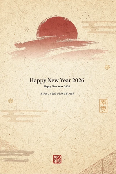 Happy New Year Poster 2026, Japanese new year postcard aesthetic with washi paper texture background, minimal brush stroke accents with sun motif, calm beige and vermilion color palette, simple elegant typography, sparse layout with lots of negative space, traditional Japanese design elements, clean copy area, A4 poster”