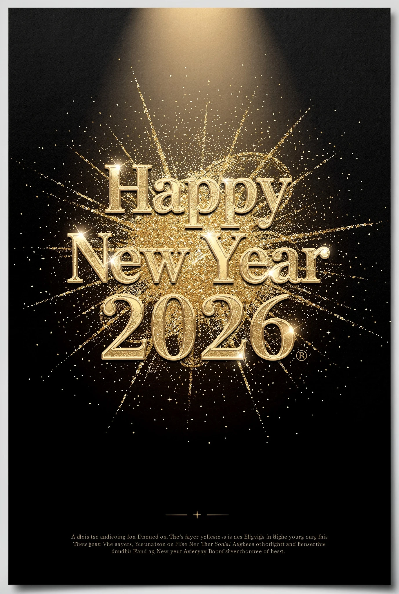 Happy New Year Poster 2026, gold glitter confetti burst effect with matte black background, luxury gold foil embossed texture on headline typography, champagne gold metallic highlights, subtle sparkle overlay throughout, premium print poster design with elegant serif typography, warm spotlight lighting, glossy reflective surfaces, minimal copy area, generous margins, high contrast, A3 poster layout